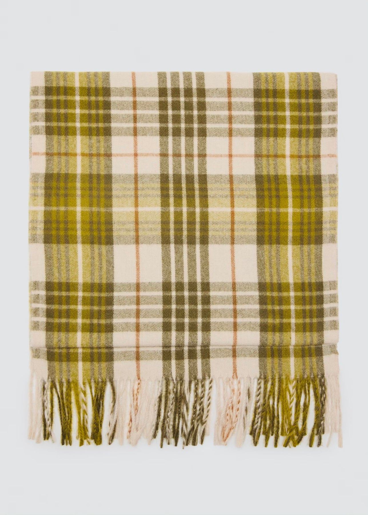 Écharpe à motif à carreaux avec bords frangés, parfaite pour un look classique et élégant.