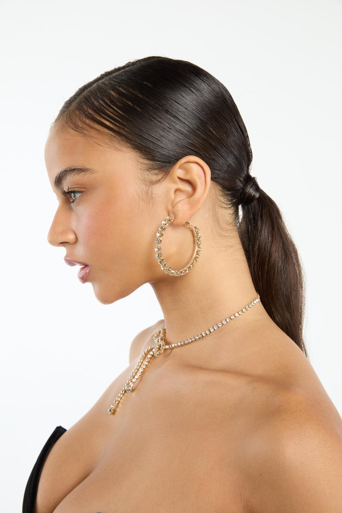 Set de boucles d’oreilles créoles. Finition métallique. Détails en strass. Fermeture classique.