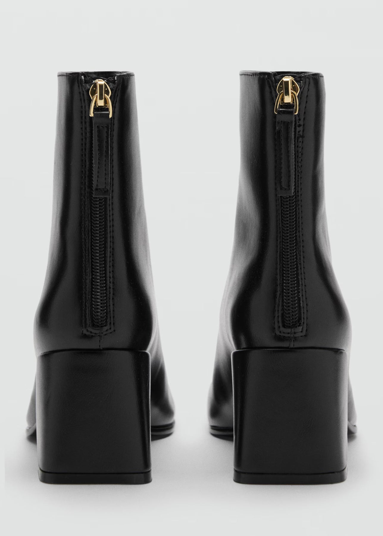 Bottines en effet cuir avec un talon bloc de 6,5 cm et un bout carré moderne. Elles se ferment facilement grâce à une fermeture éclair située à l’arrière. Confortables et stables, parfaites pour un look chic au quotidien.