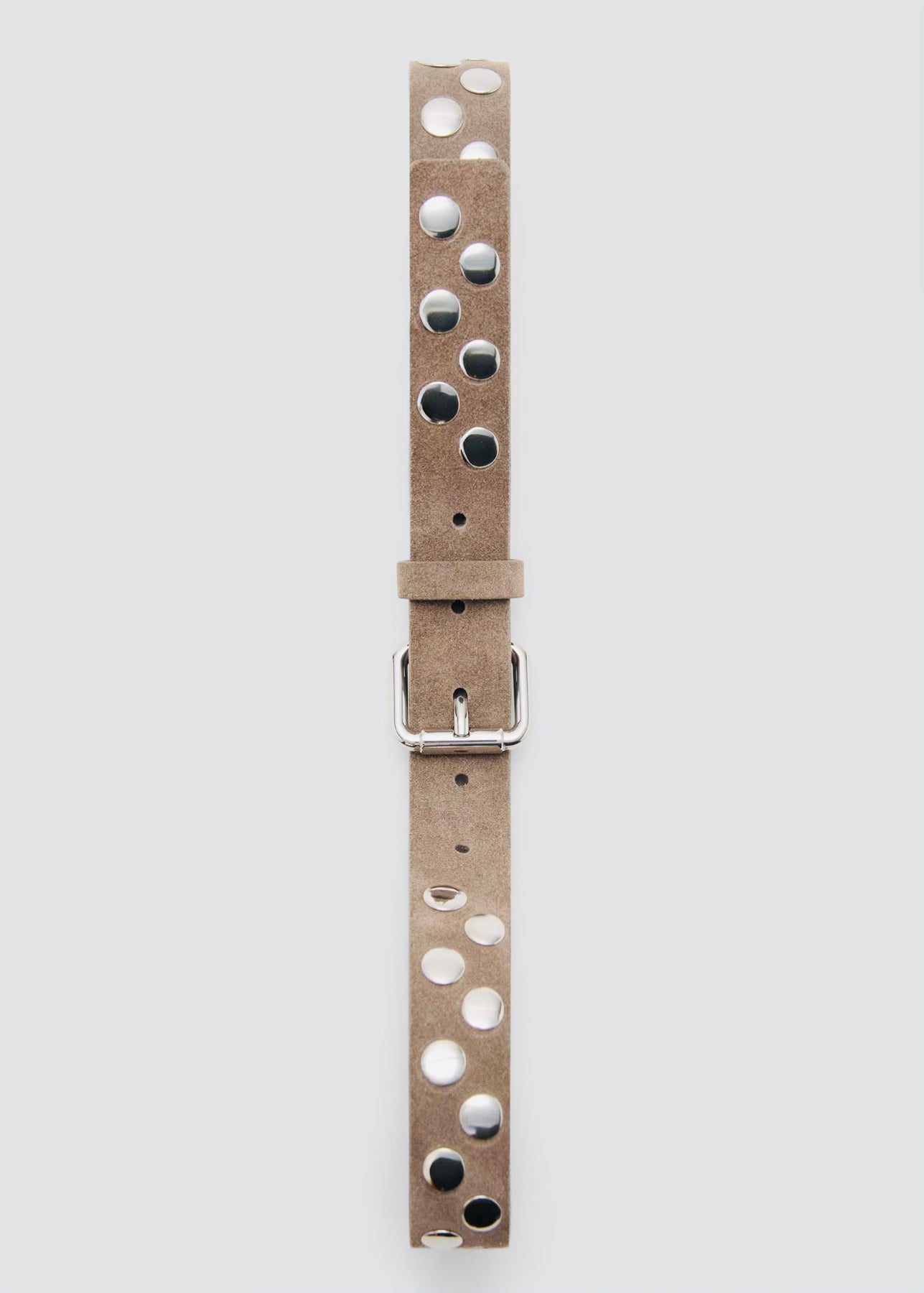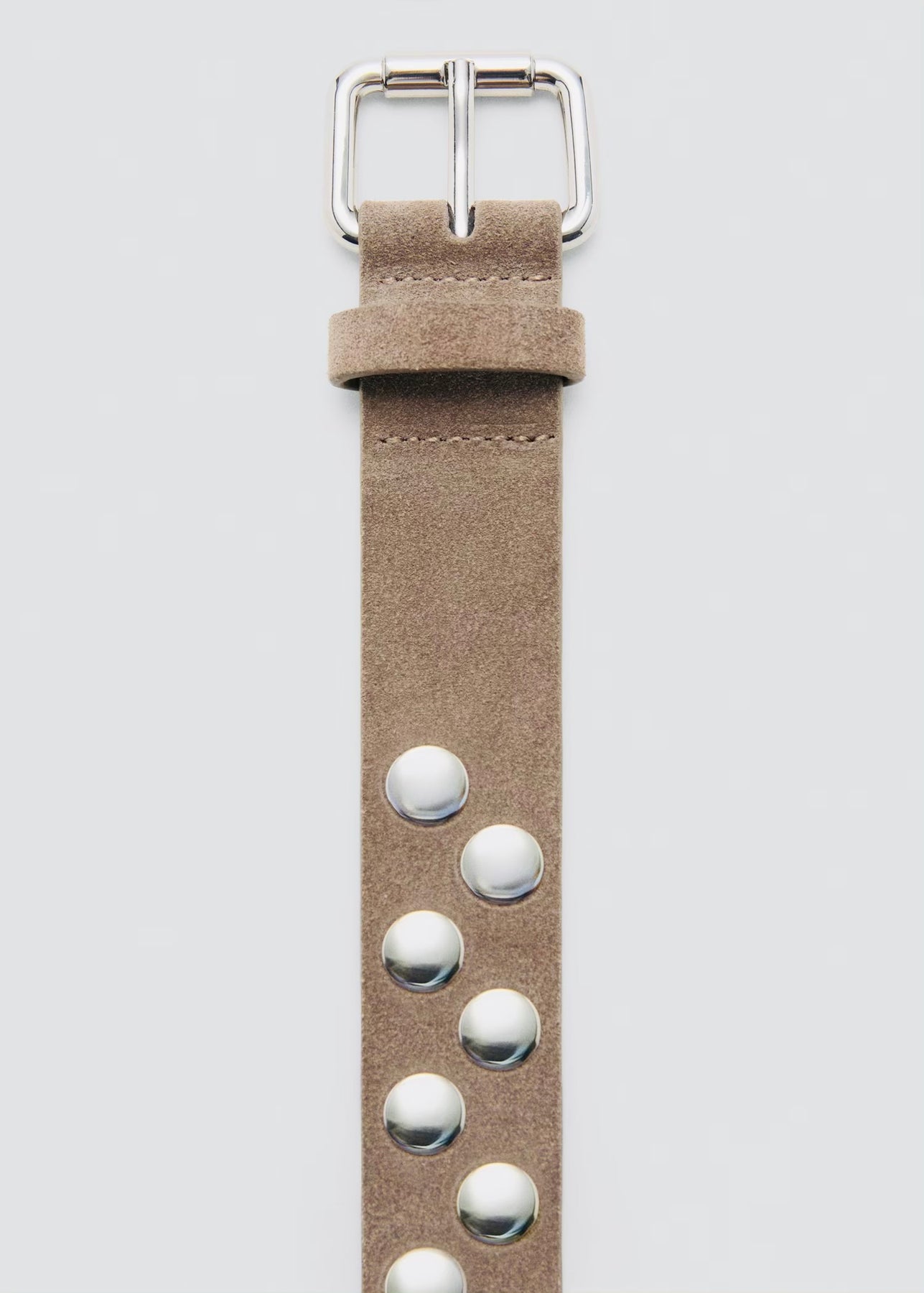 Ceinture en daim véritable au style affirmé, ornée de clous métalliques pour une touche rock et élégante. Elle comporte une boucle carrée en métal et une doublure résistante, idéale pour compléter vos tenues avec caractère. Exclusivité en ligne.