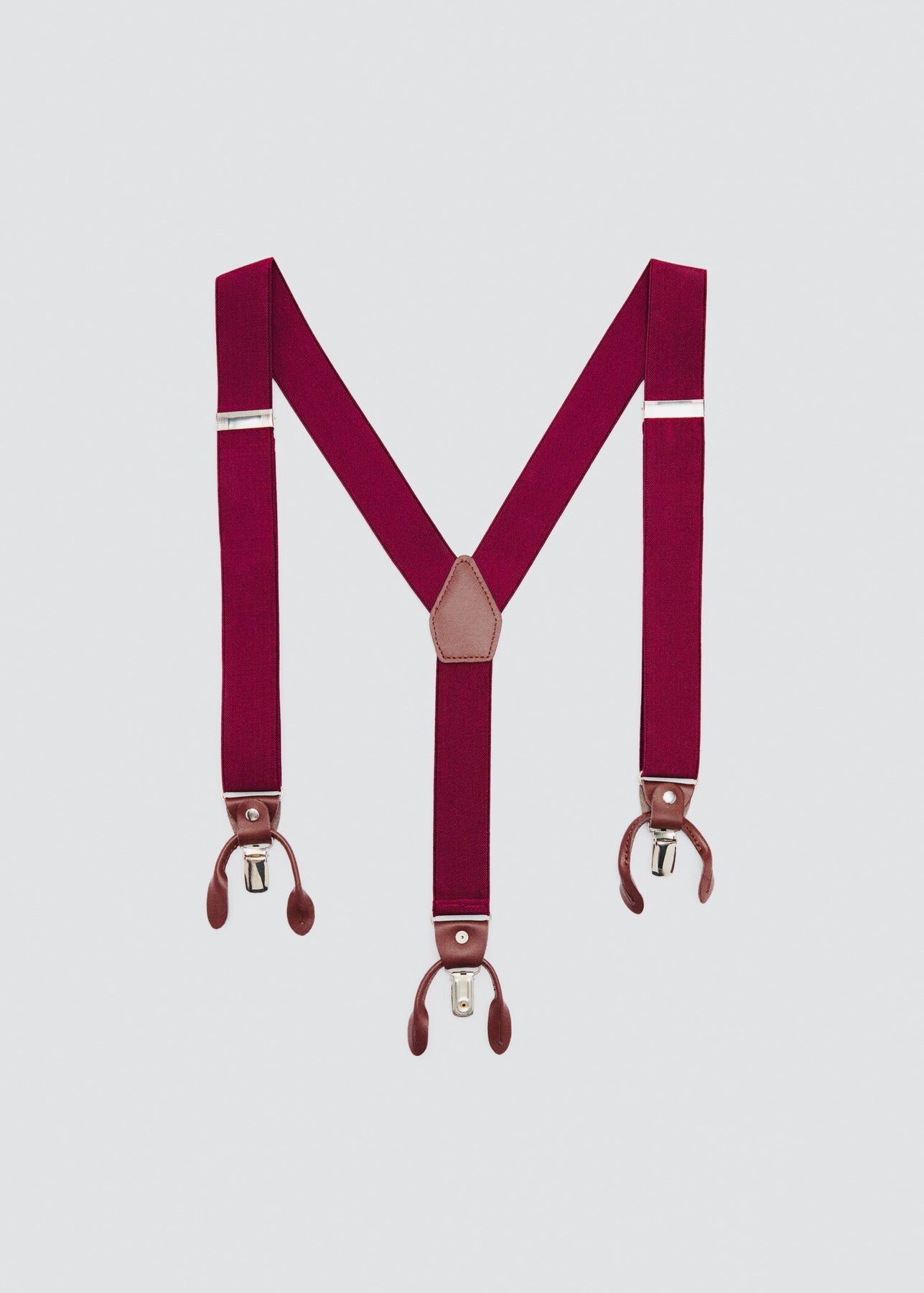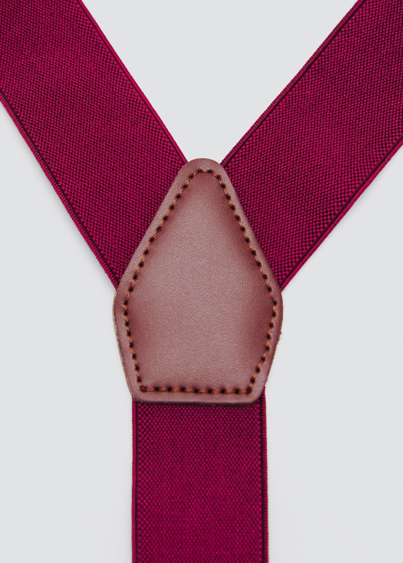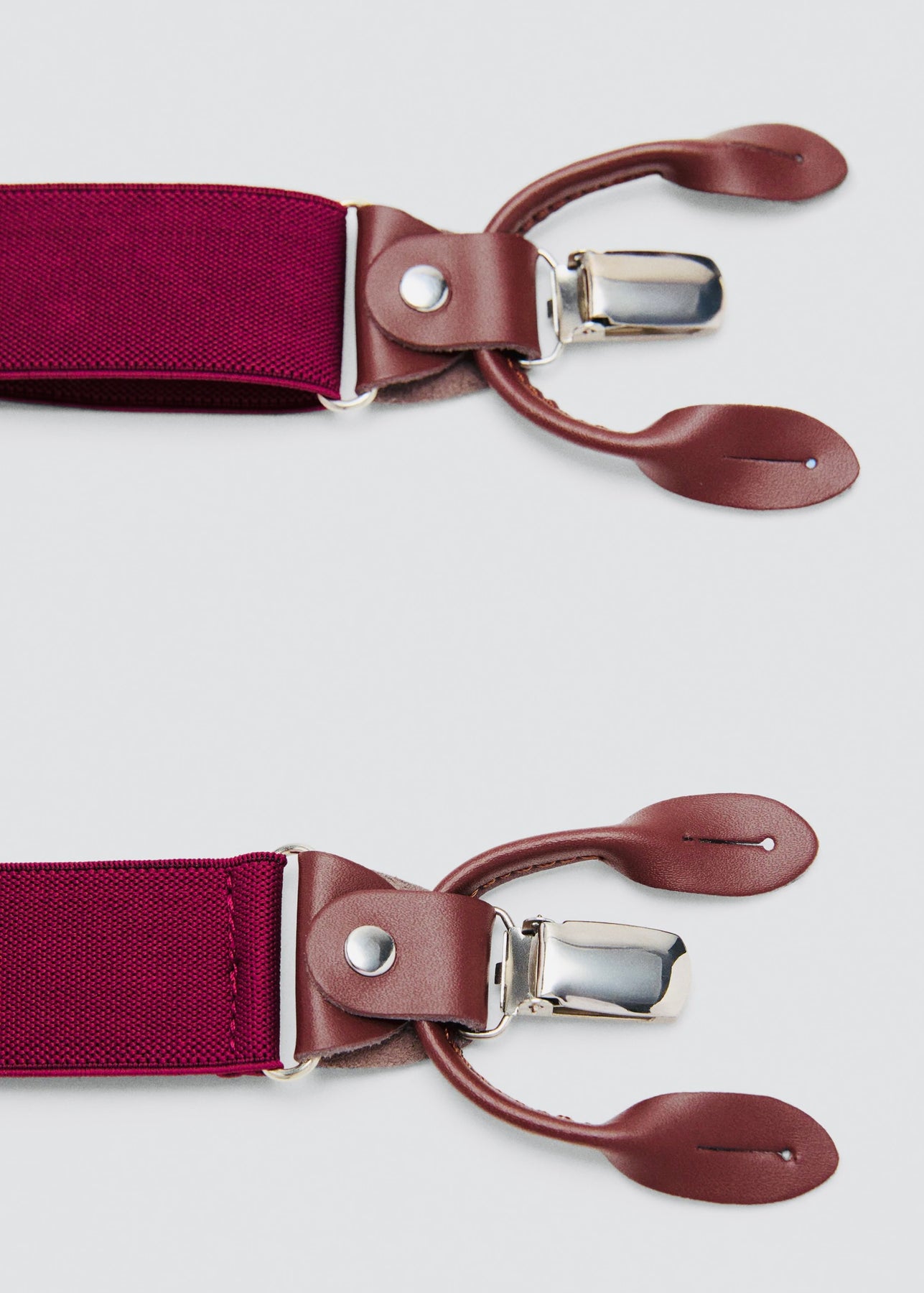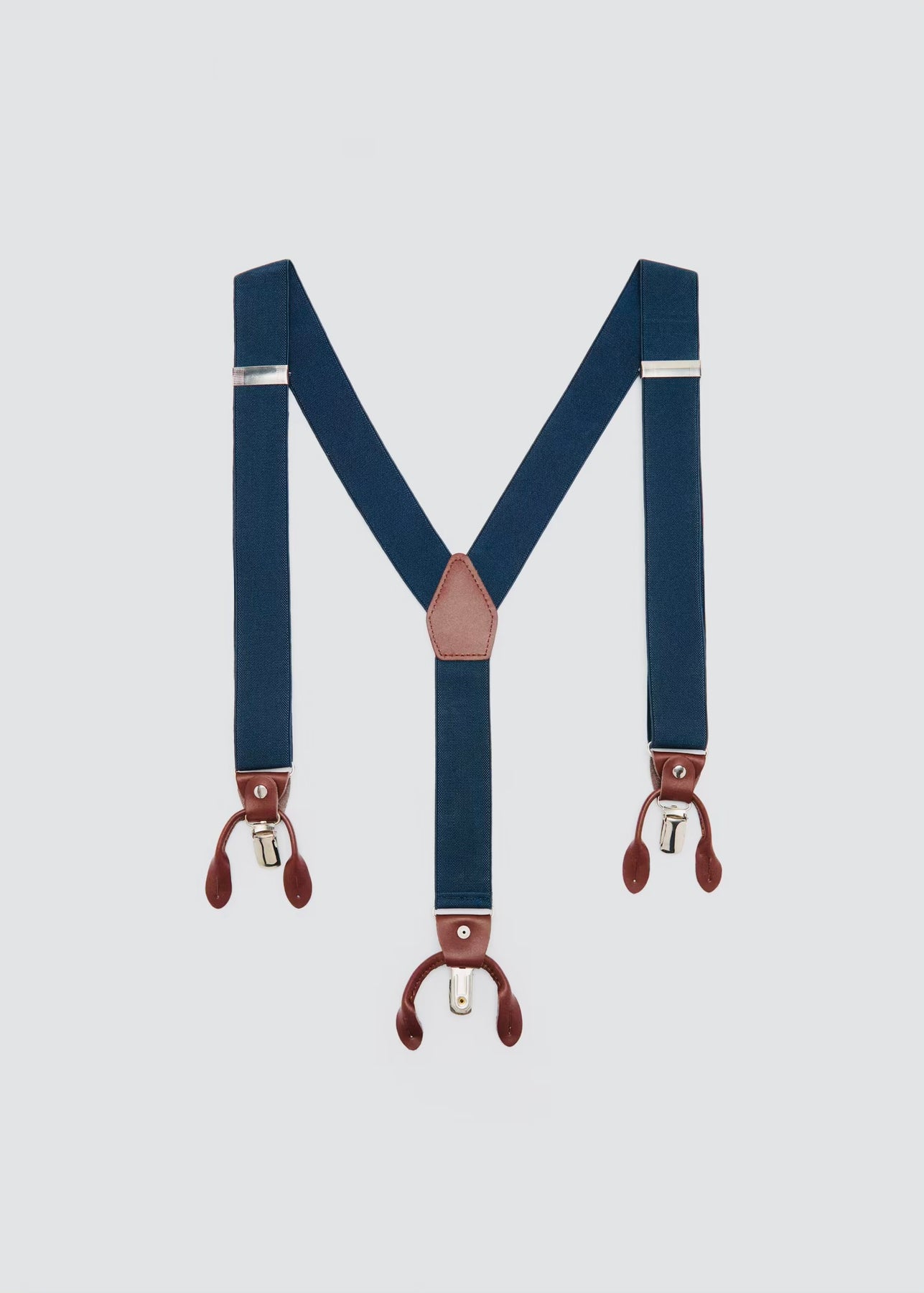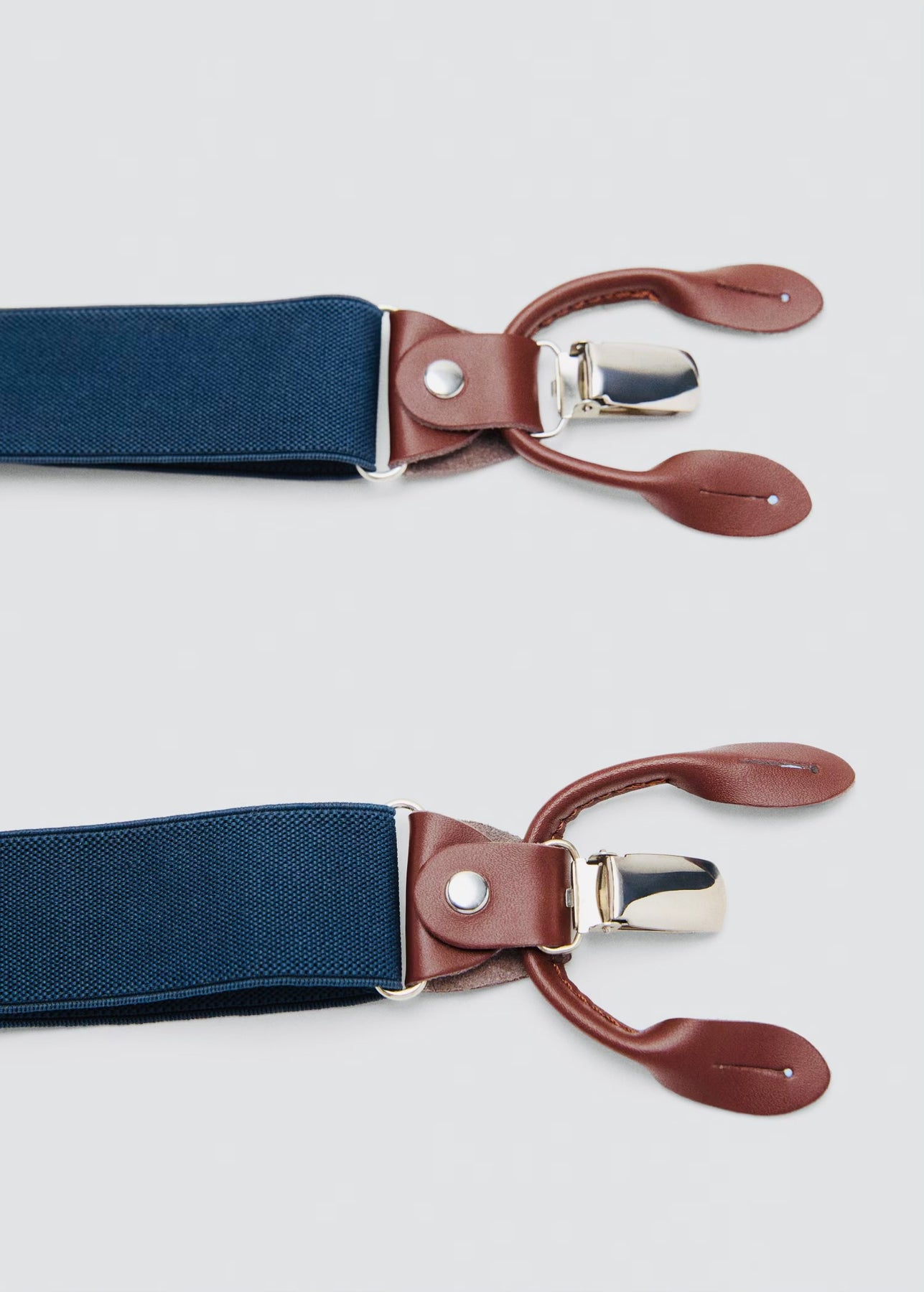 Bretelles élastiques ajustables. Détails en cuir. Attaches avec pince métallique et pattes pour boutons.