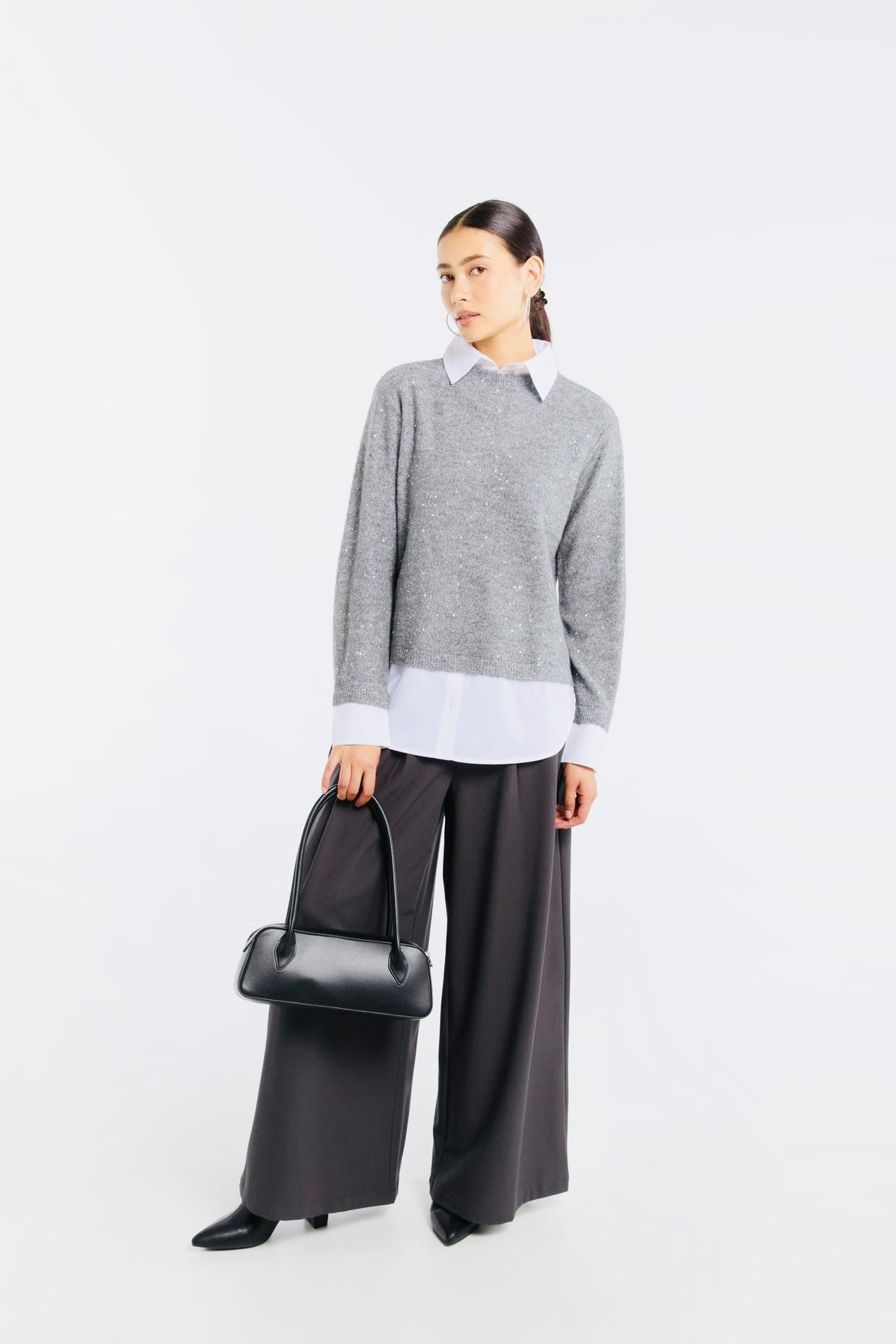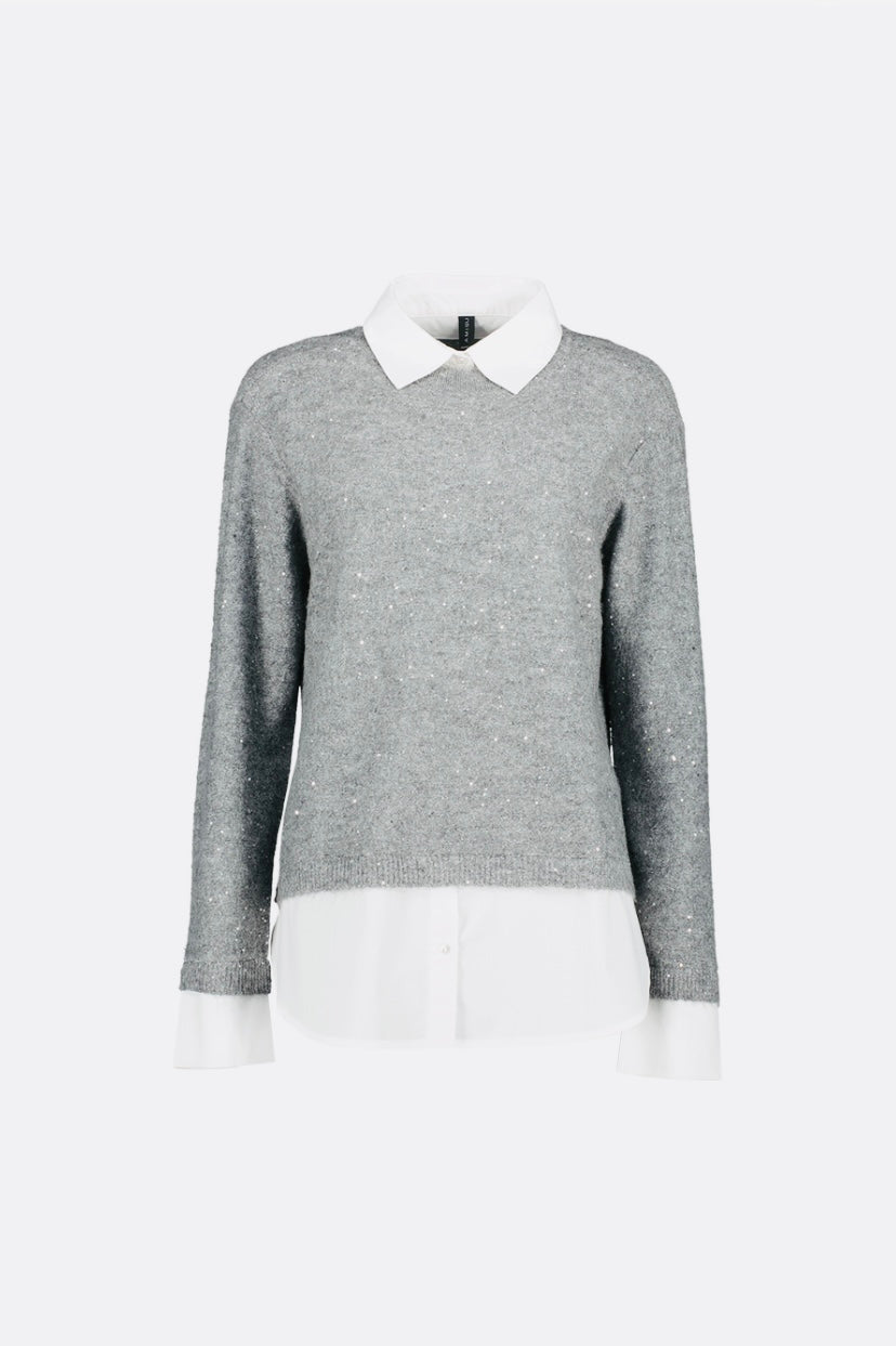Chemisier élégant effet superposé, combinant un tissu scintillant et un empiècement poitrine contrastant pour un look chic et moderne. Détails en paillettes pour une touche festive.
