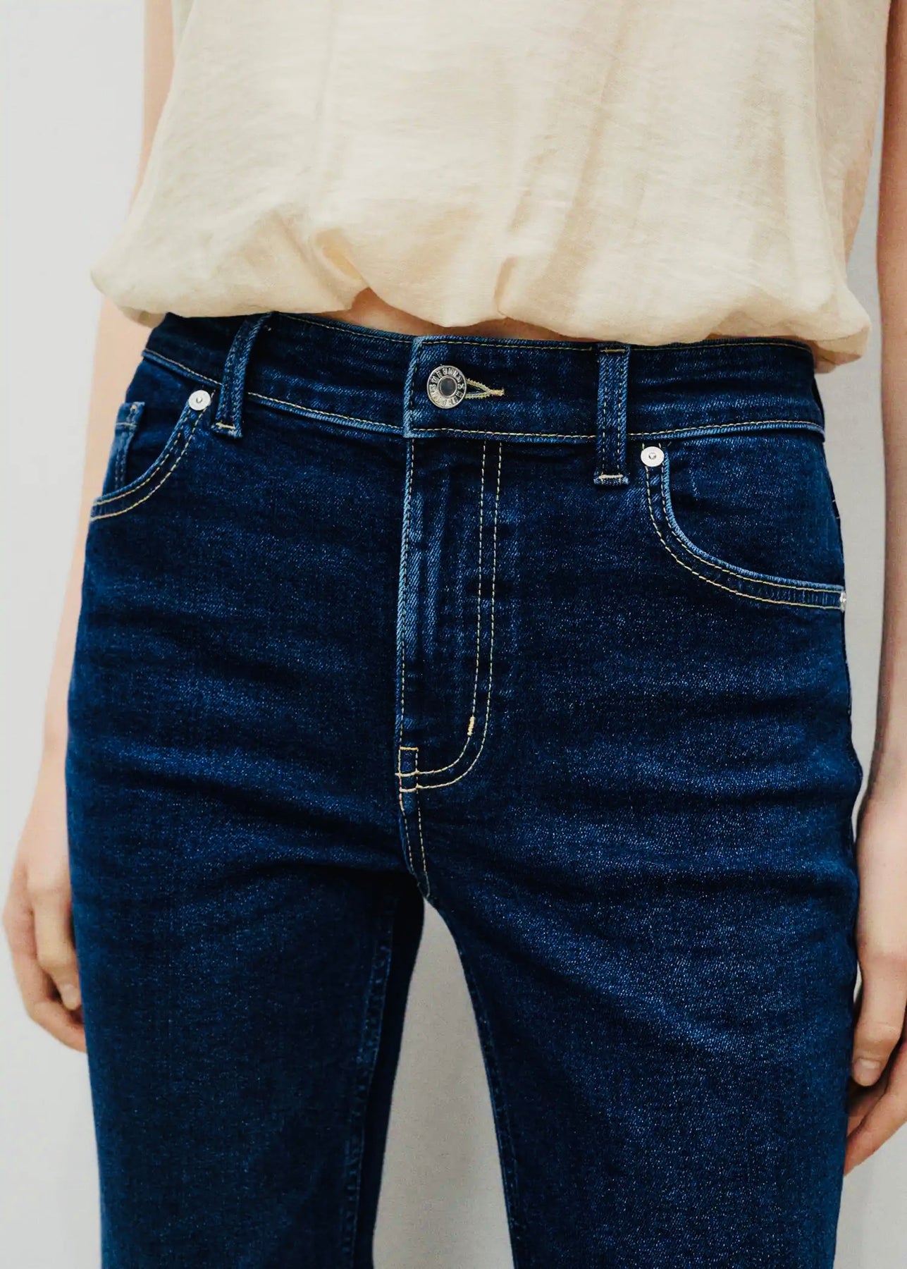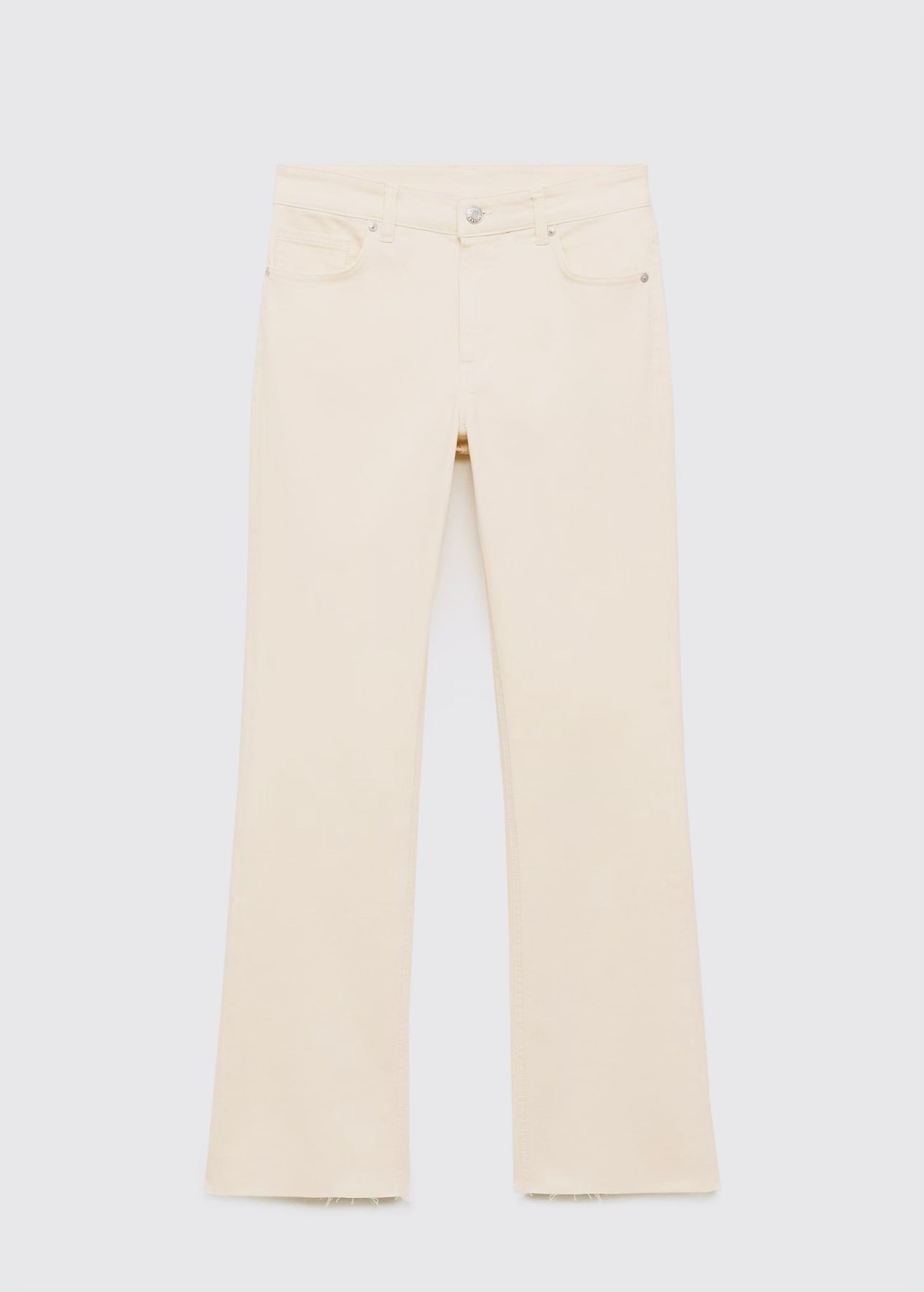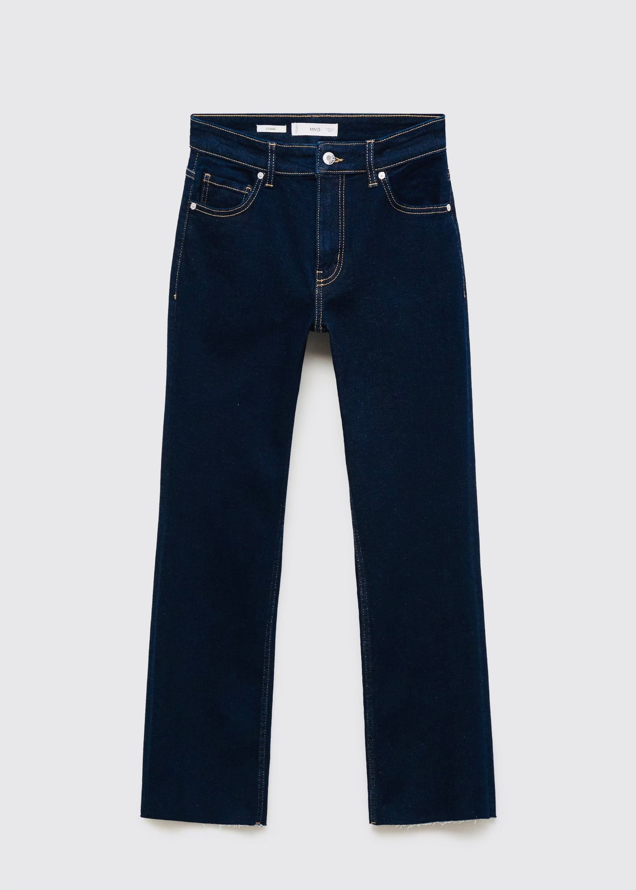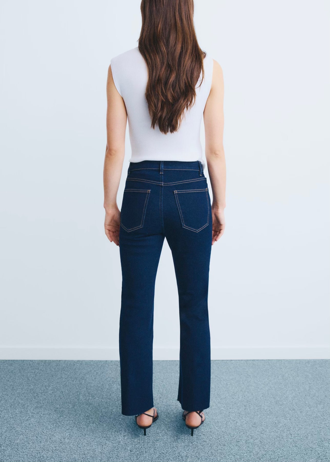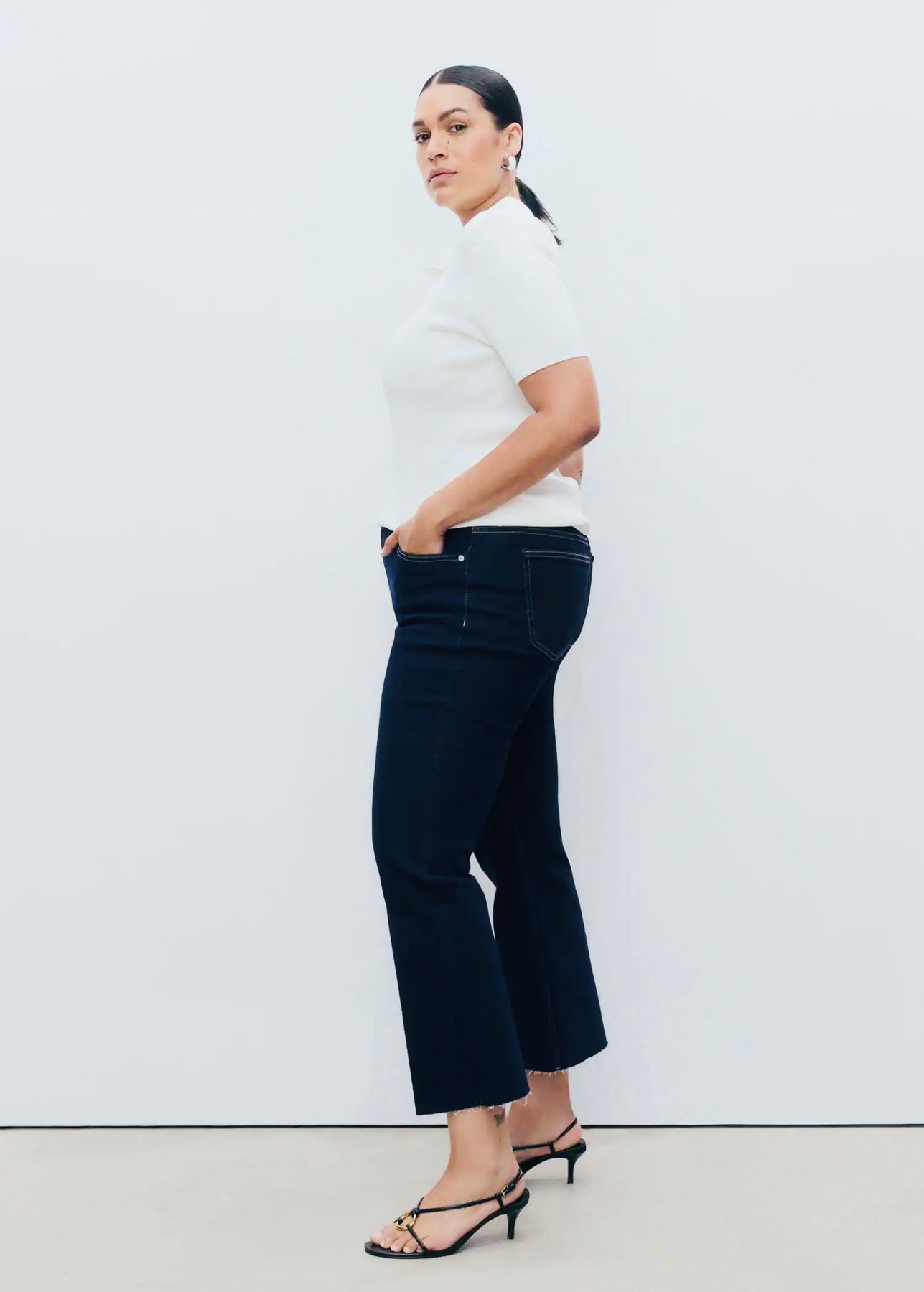 Jean en denim style cowboy, élastique, à coupe flare et longueur crop. Taille mi-haute avec passants pour ceinture, cinq poches et bas effiloché. Fermeture par bouton et fermeture éclair. Longueur intérieure 65 cm avec tissu confort élastique.