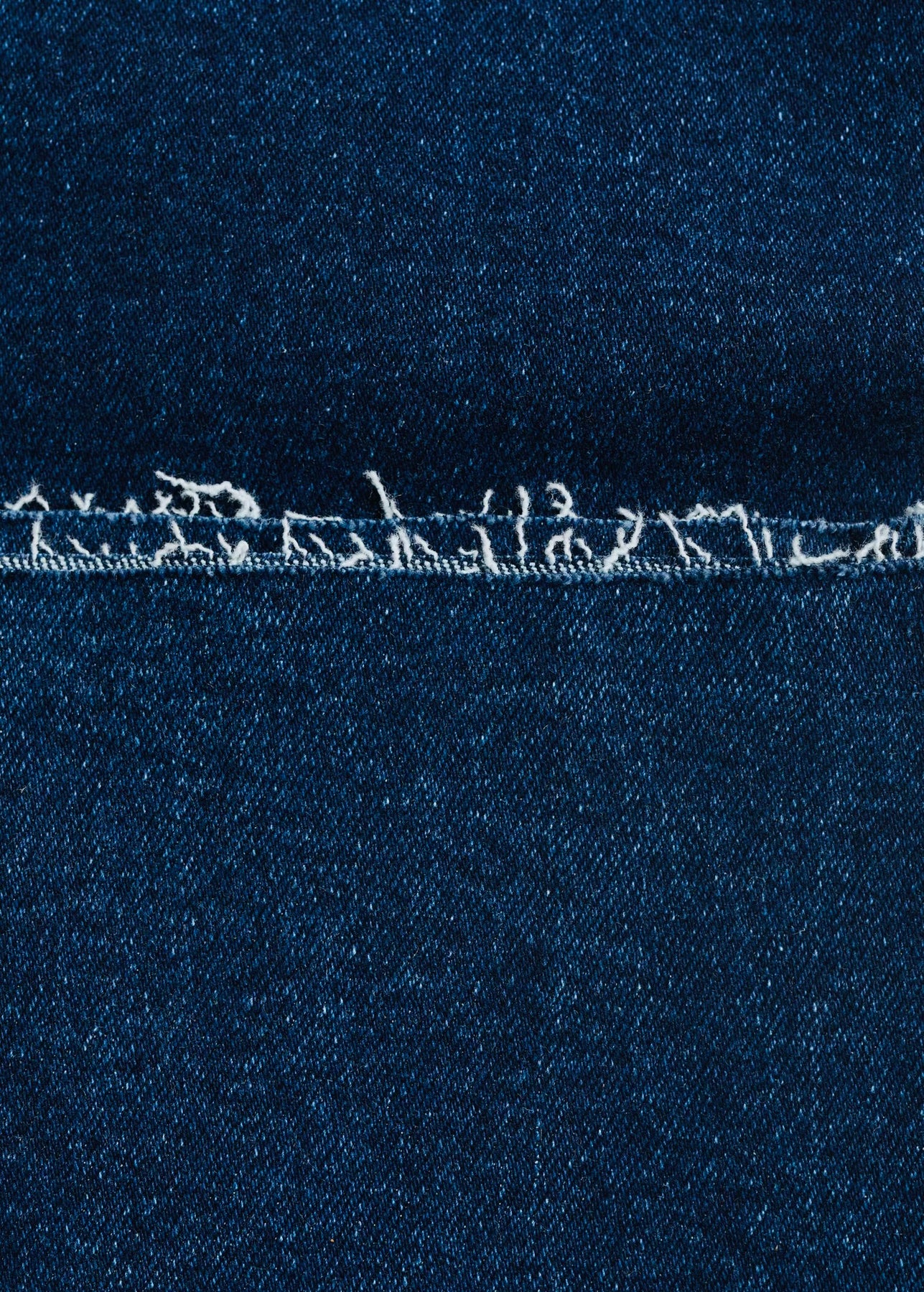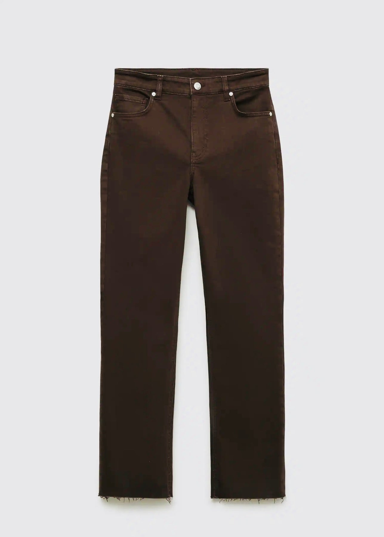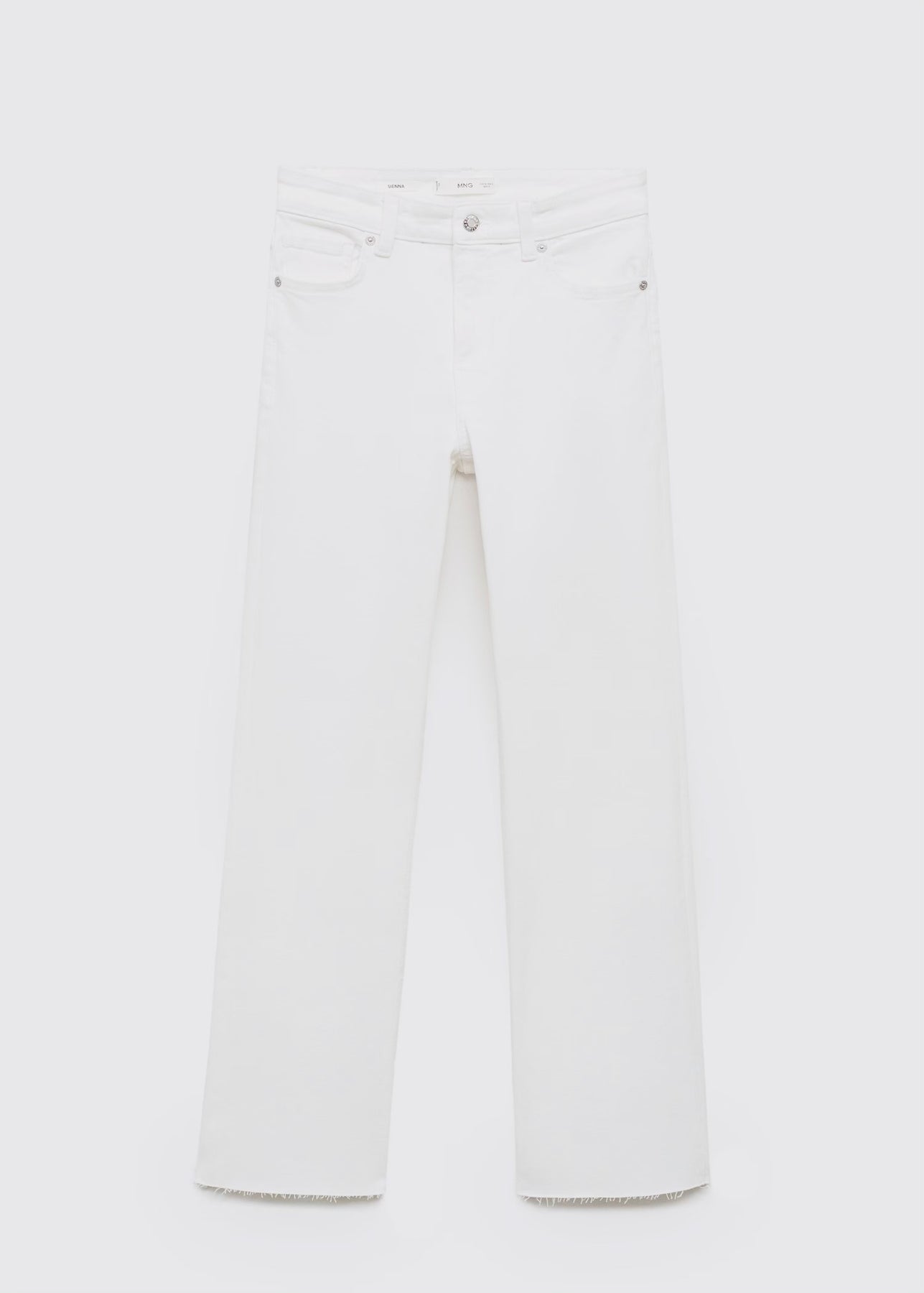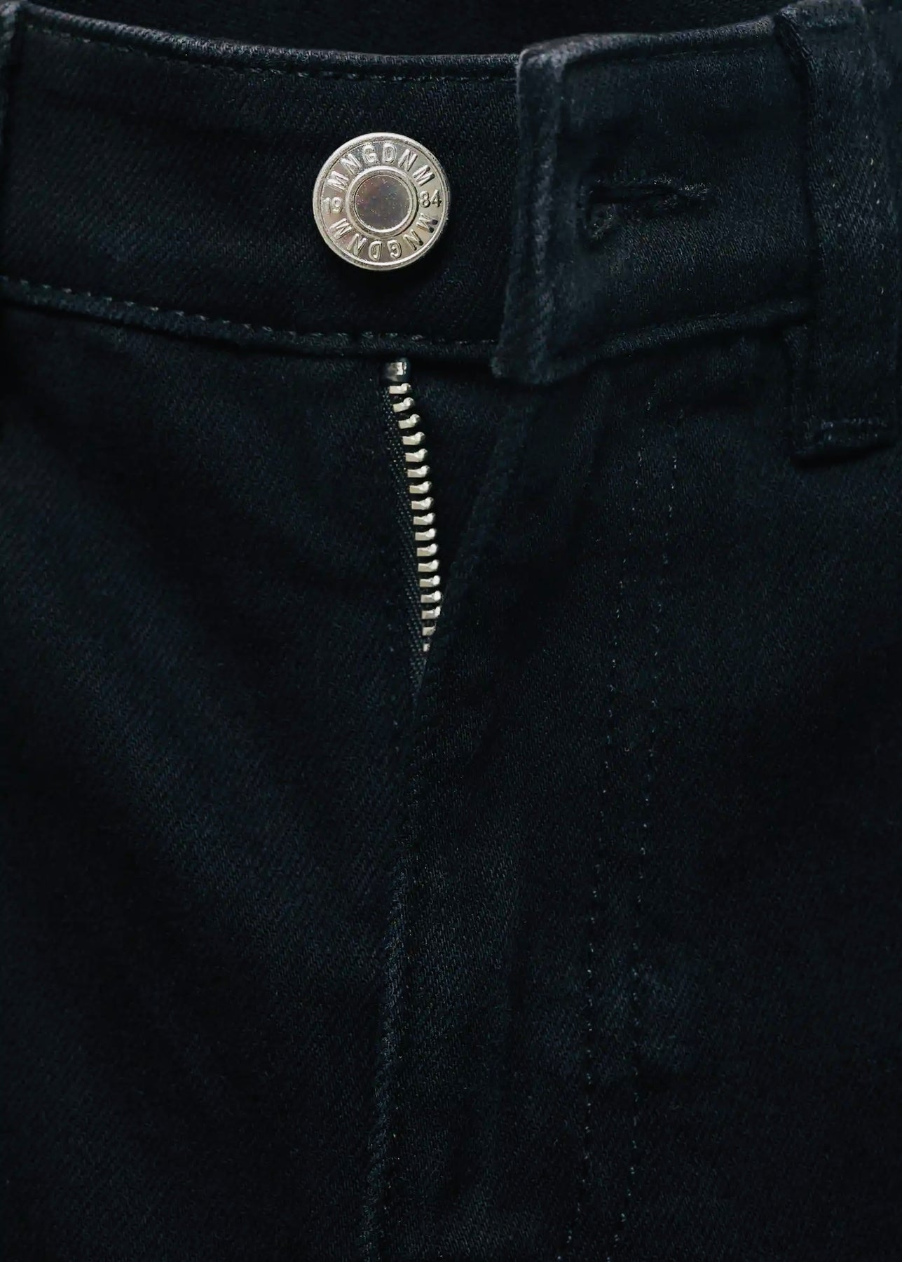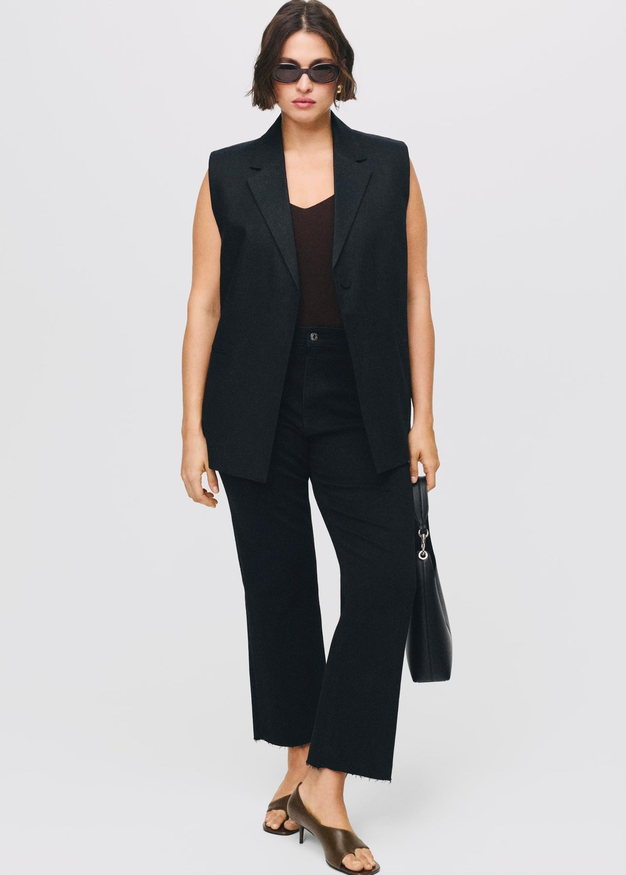 Jean en denim style cowboy, élastique, à coupe flare et longueur crop. Taille mi-haute avec passants pour ceinture, cinq poches et bas effiloché. Fermeture par bouton et fermeture éclair. Longueur intérieure 65 cm avec tissu confort élastique.