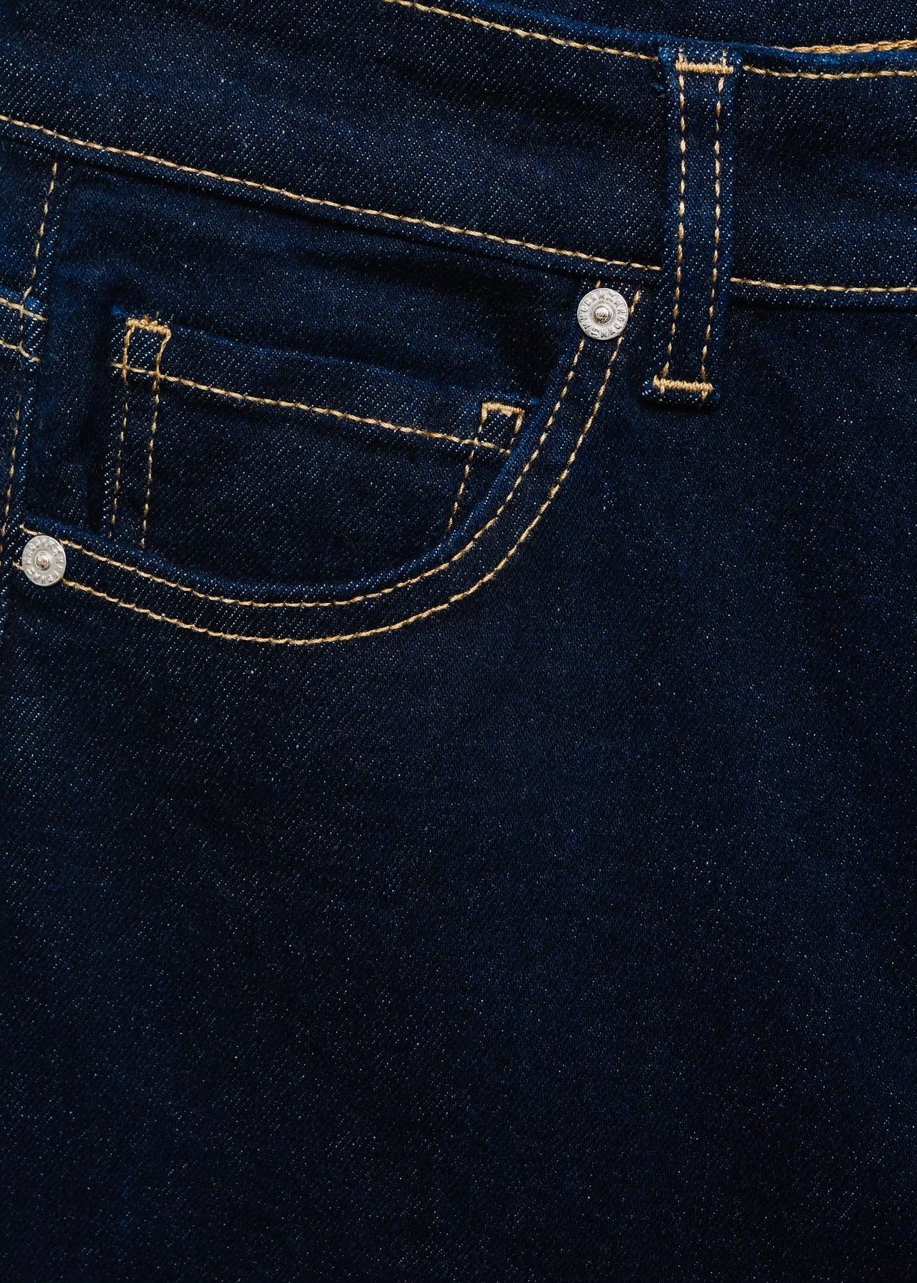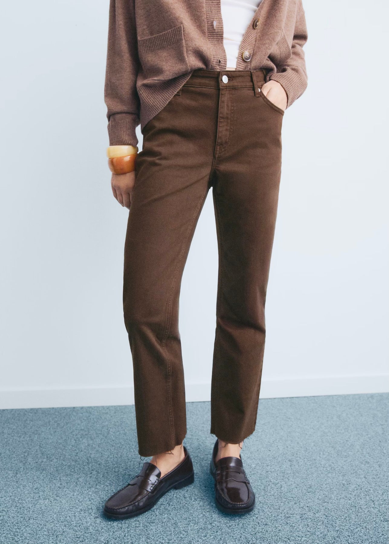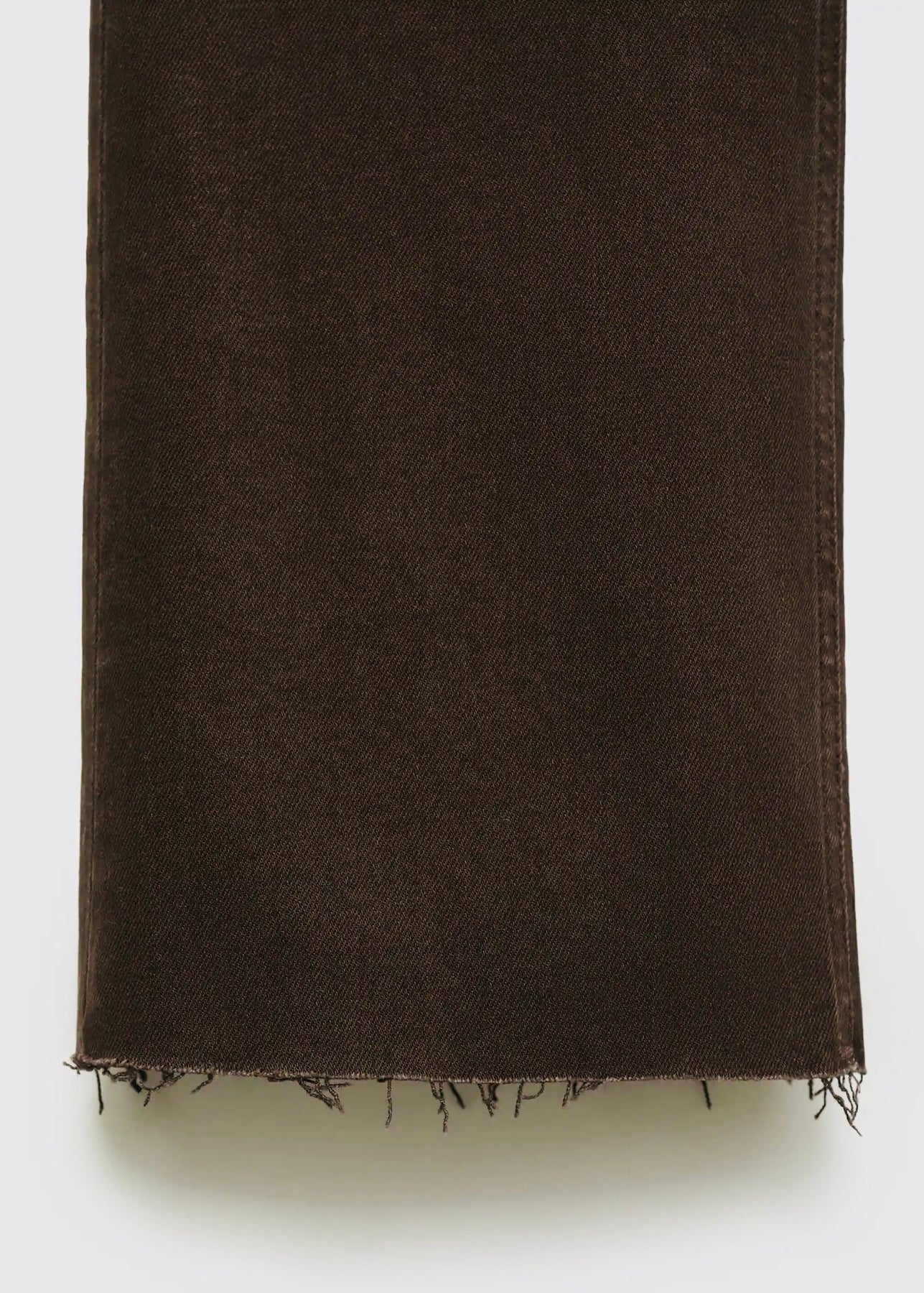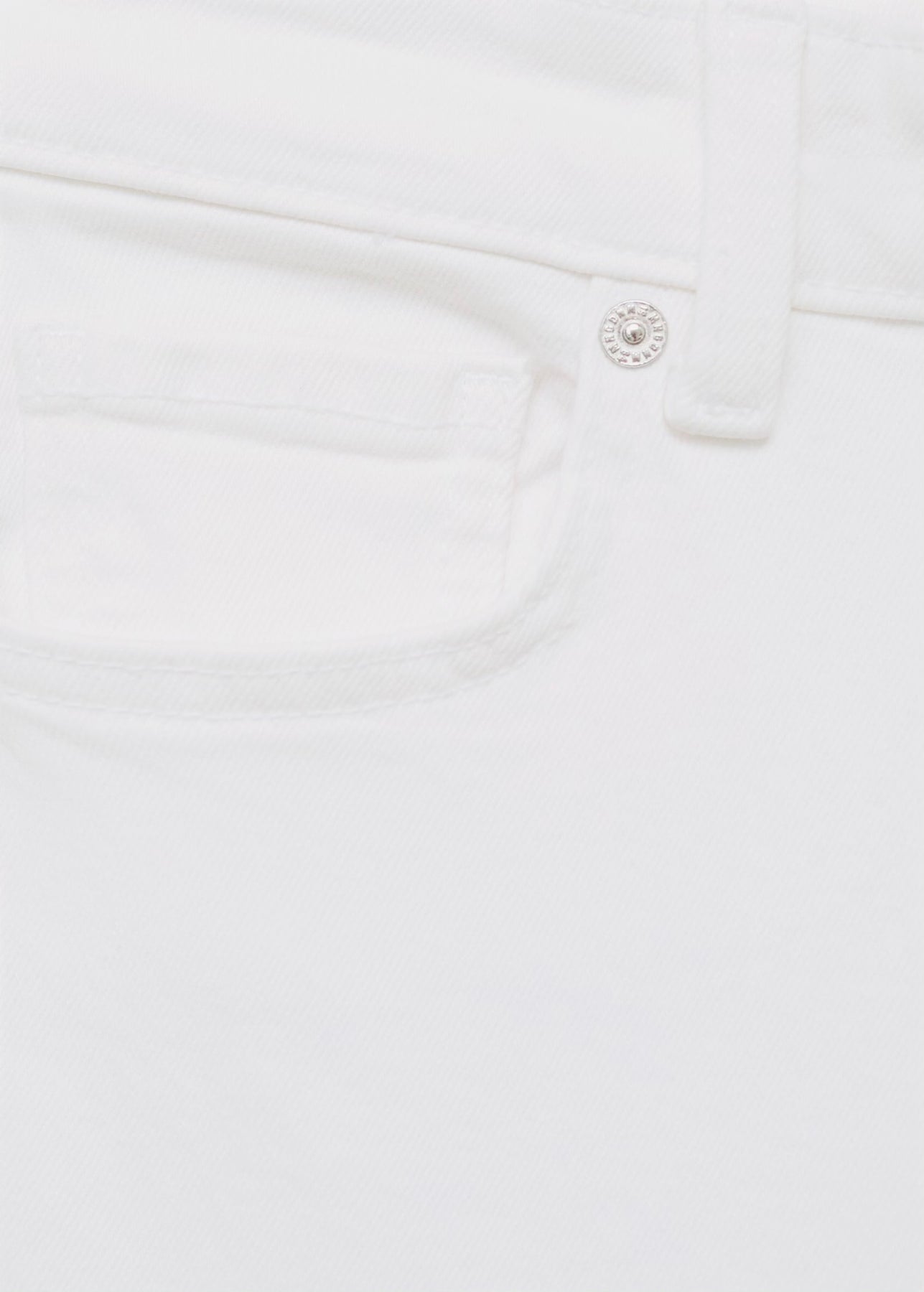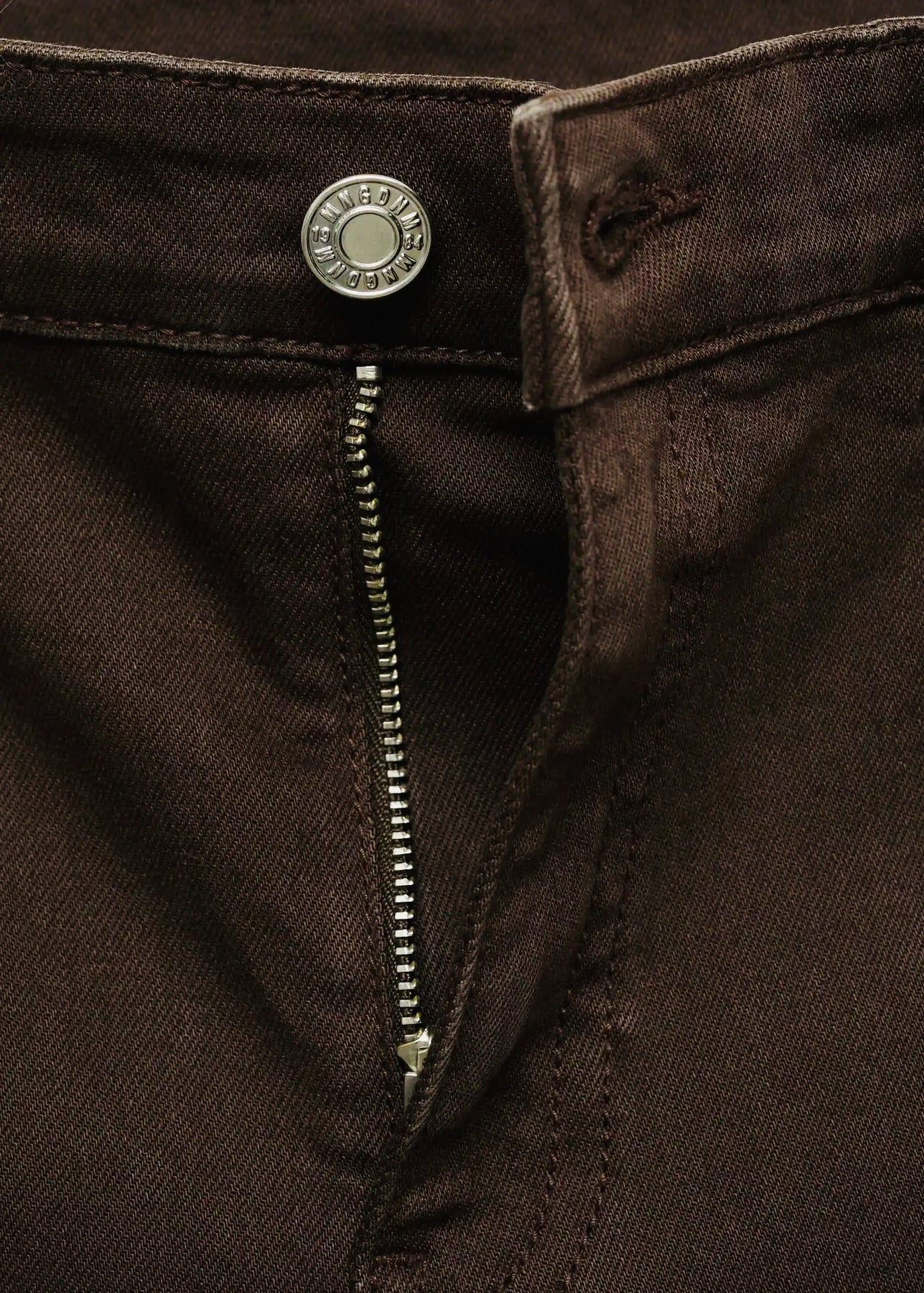 Jean en denim style cowboy, élastique, à coupe flare et longueur crop. Taille mi-haute avec passants pour ceinture, cinq poches et bas effiloché. Fermeture par bouton et fermeture éclair. Longueur intérieure 65 cm avec tissu confort élastique.