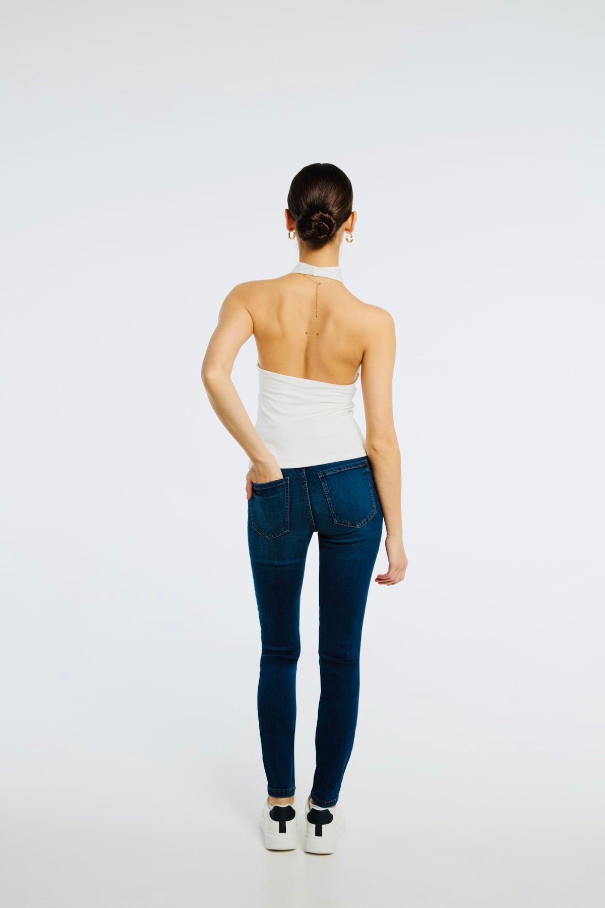 Jean skinny à taille haute, conçu pour épouser la silhouette tout en offrant confort et liberté de mouvement. Un essentiel polyvalent pour un look moderne et féminin.