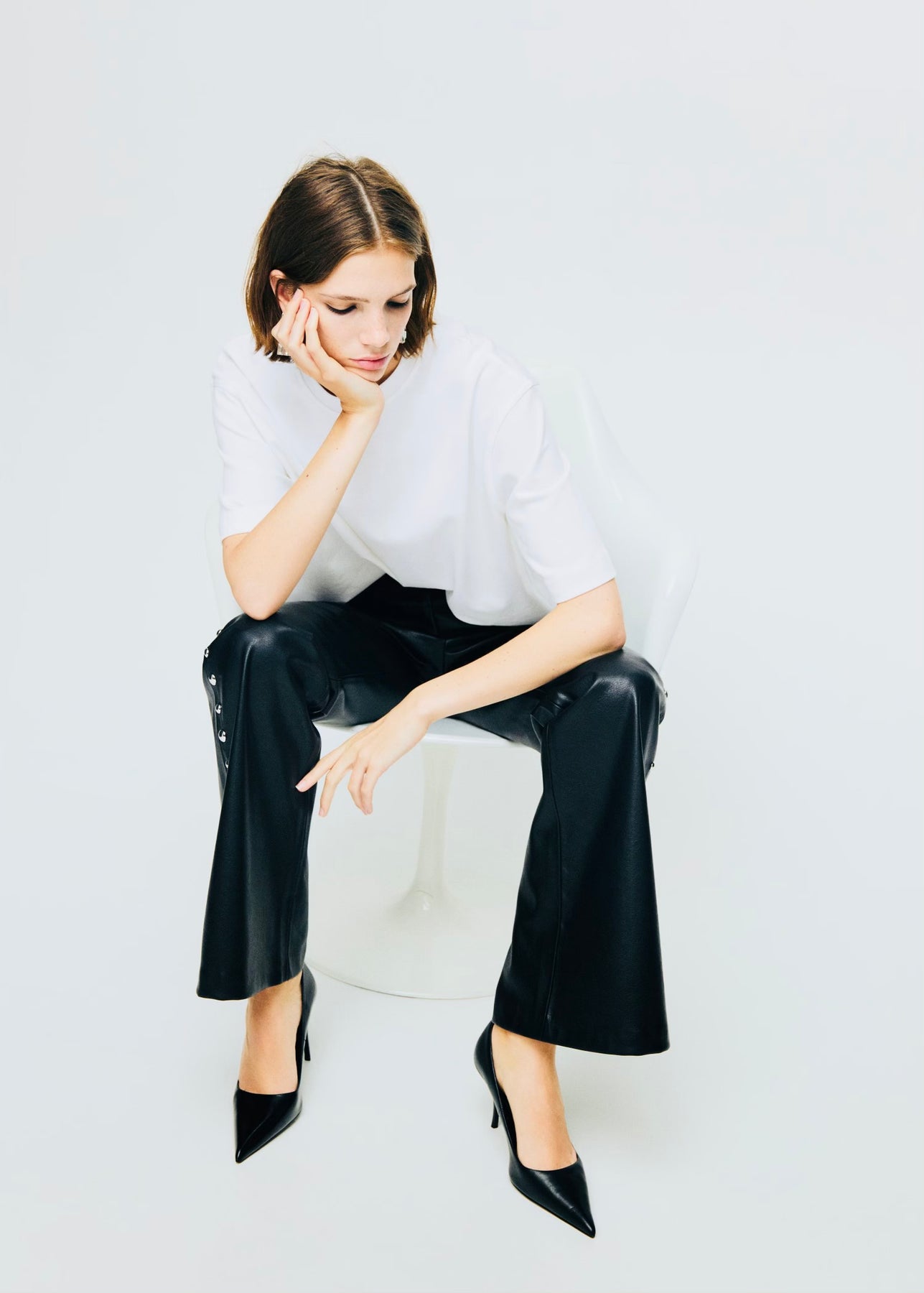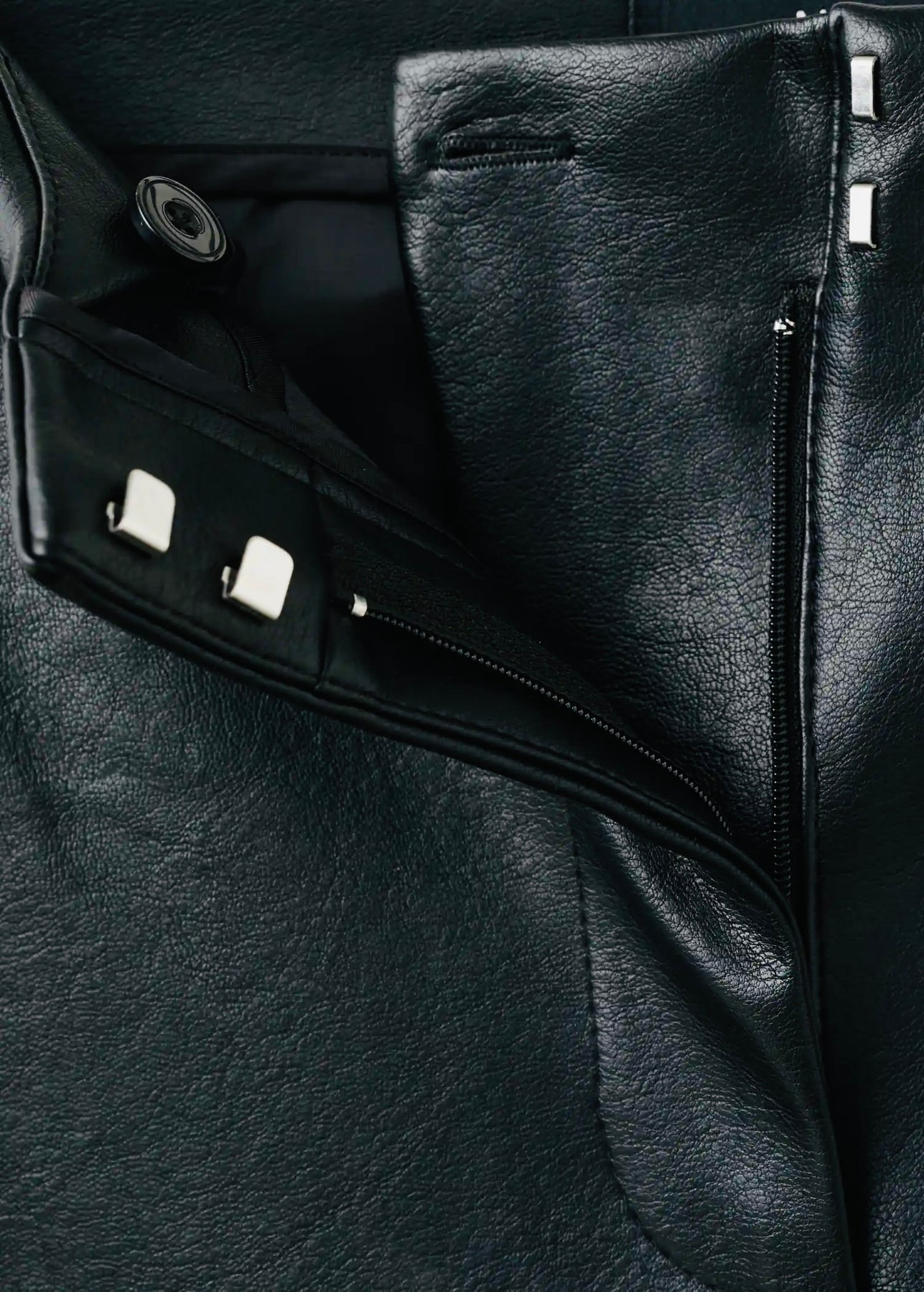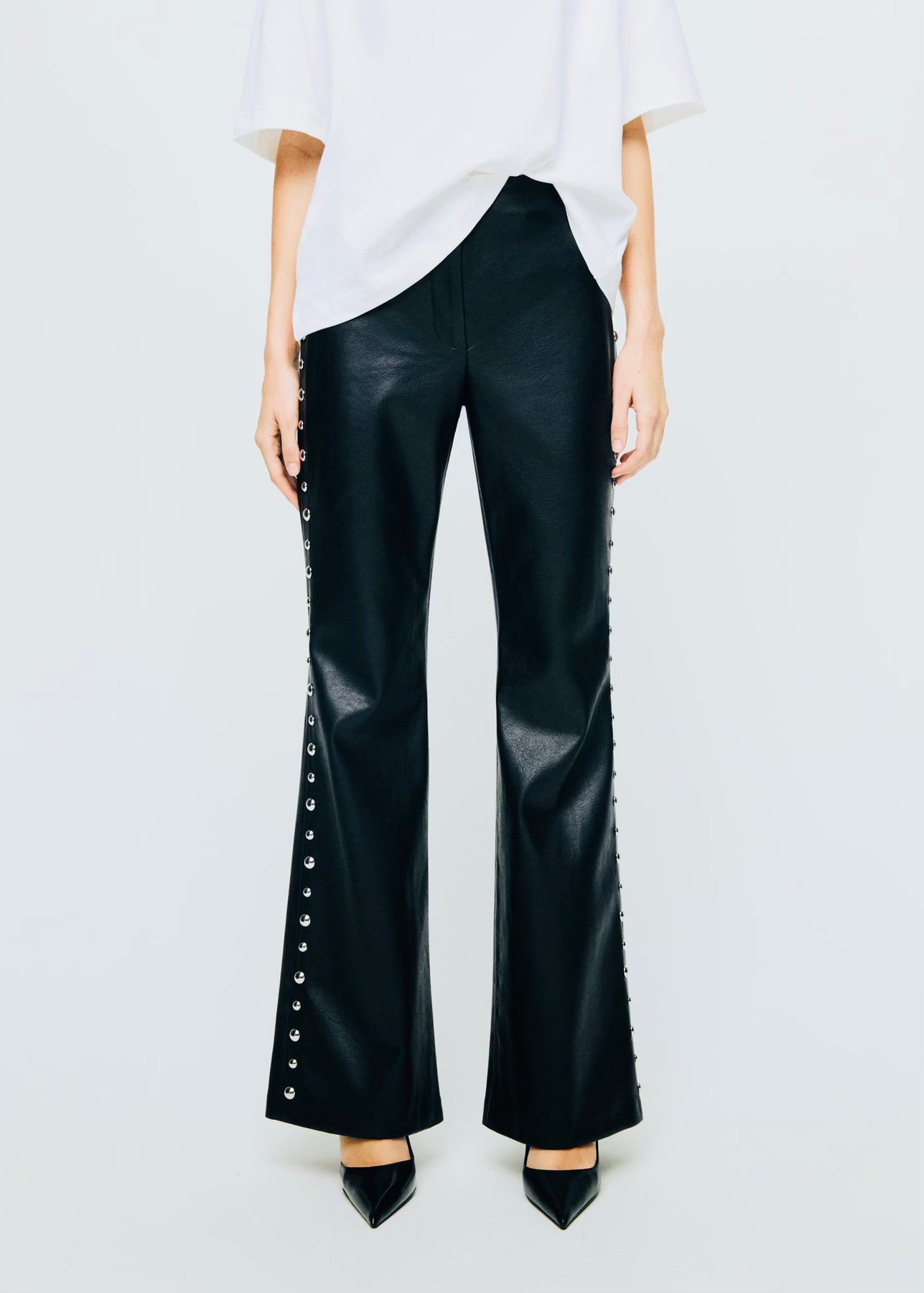 Pantalon effet cuir, au design long et à la coupe flare élégante. Il présente une taille mi-haute, un ornement de clous métalliques et une fermeture Éclair avec agrafe et bouton dissimulés. La doublure intérieure assure confort et maintien. Idéal pour des looks de fêtes et d’événements, avec une touche rock et sophistiquée.