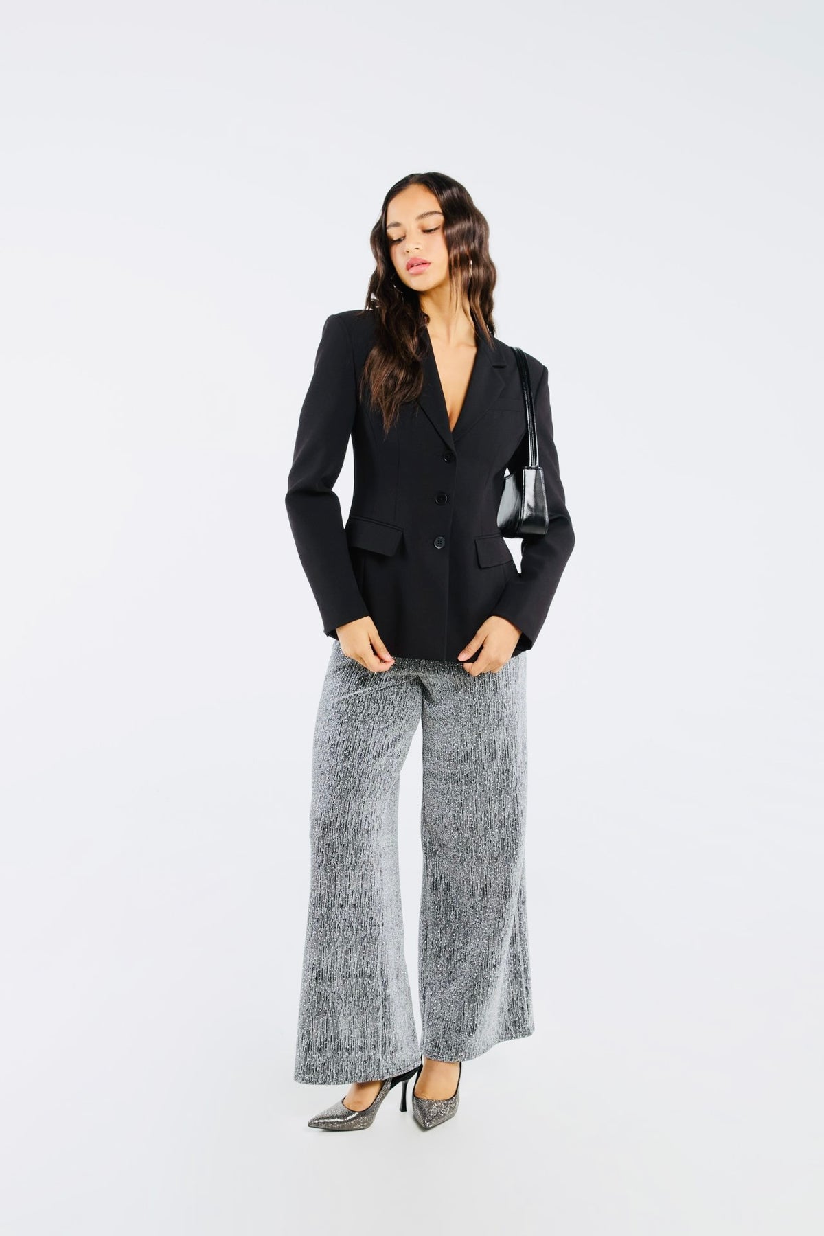 Pantalon de survêtement à effet scintillant, confectionné dans un tissu extensible avec fils métallisés pour une touche lumineuse. Coupe confortable, idéal pour un style à la fois décontracté et tendance.
