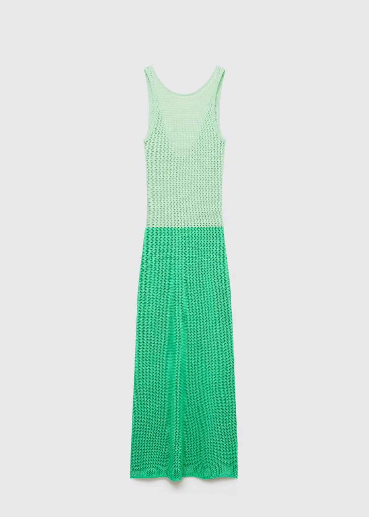 Robe longue au design bicolore en maille crochetée. Confectionnée en coton, elle présente une coupe droite, un col rond, de larges bretelles et un dos décolleté. Sans fermeture, cette pièce allie confort et élégance pour un look estival et décontracté.