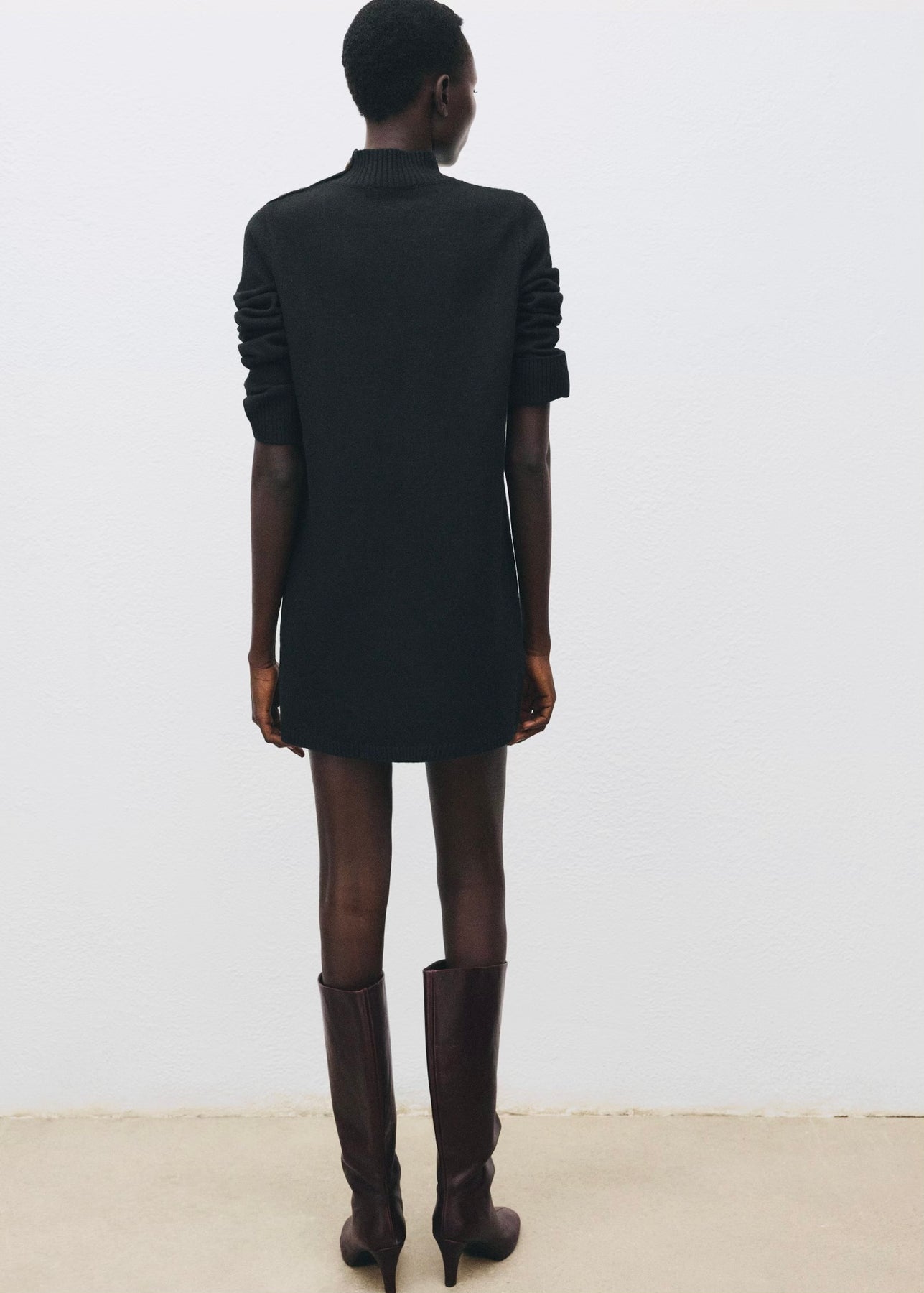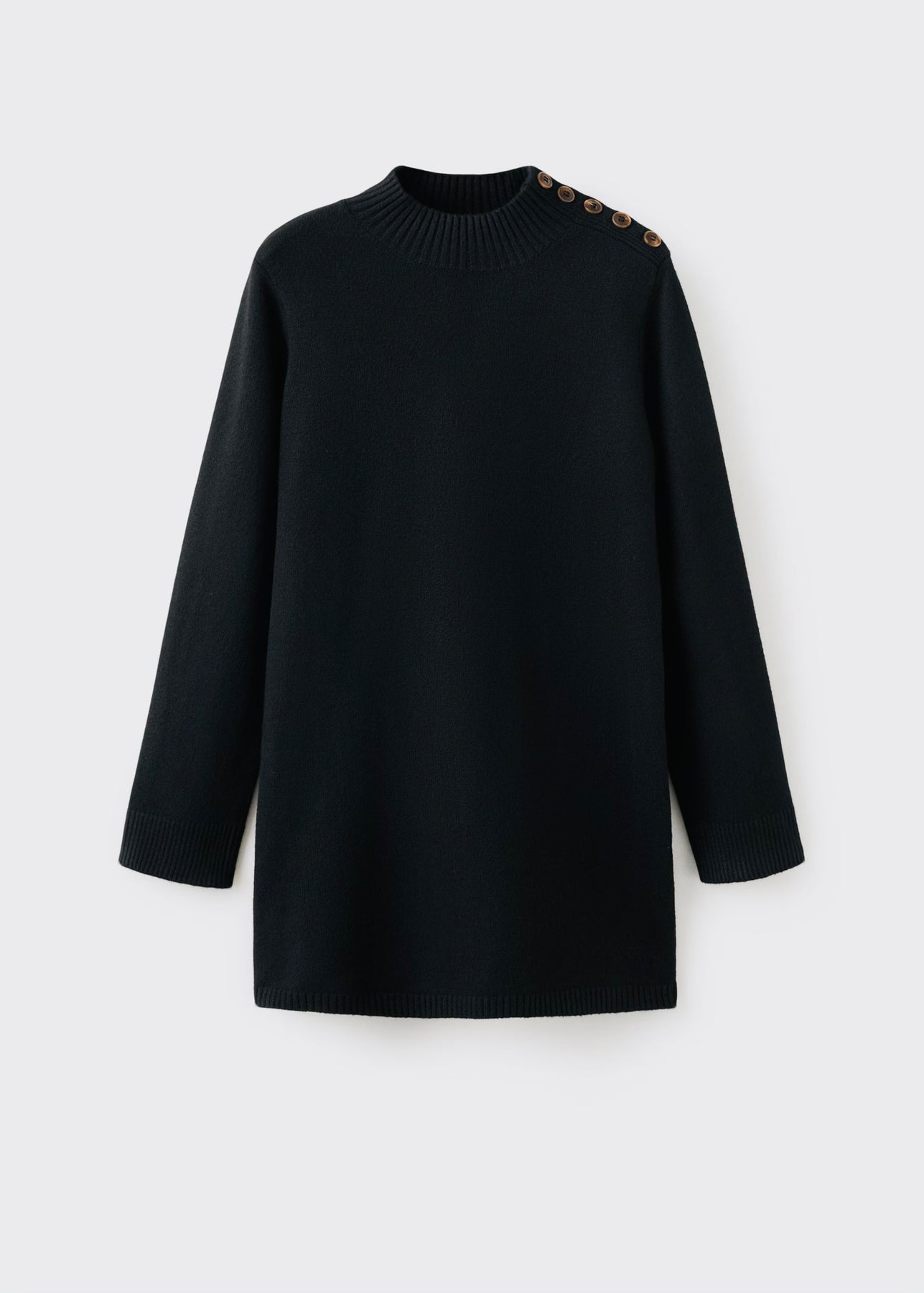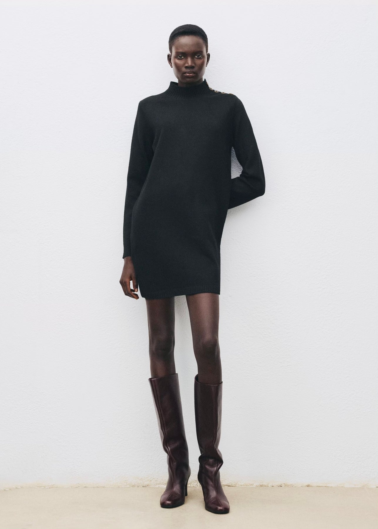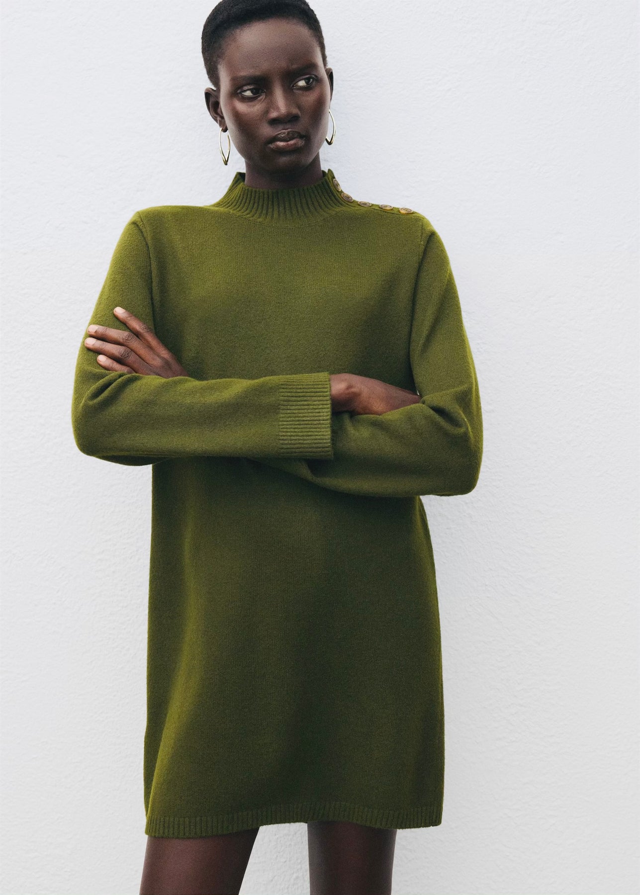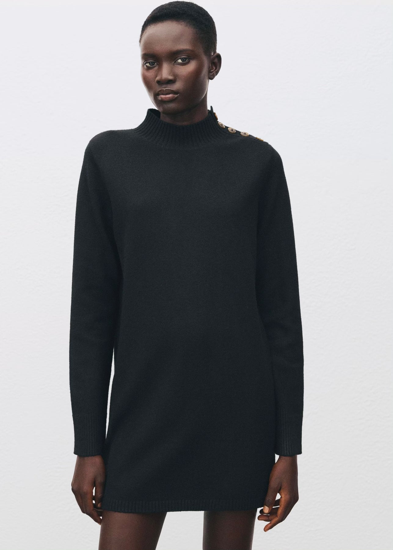 Robe courte en maille avec col Perkins et manches longues. Dotée d’un détail de boutons sur l’épaule, elle allie confort et élégance pour un look moderne au quotidien.