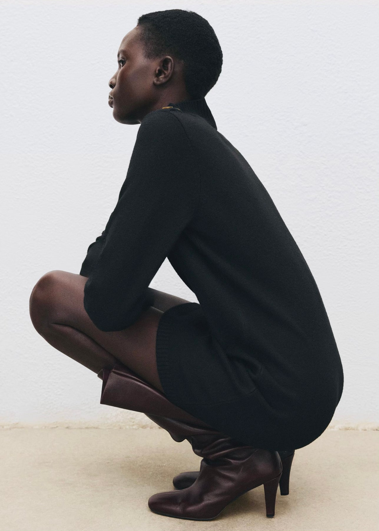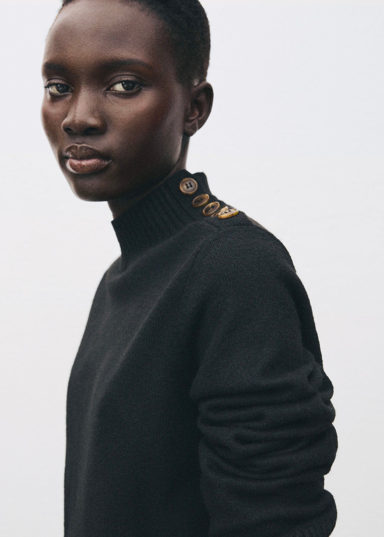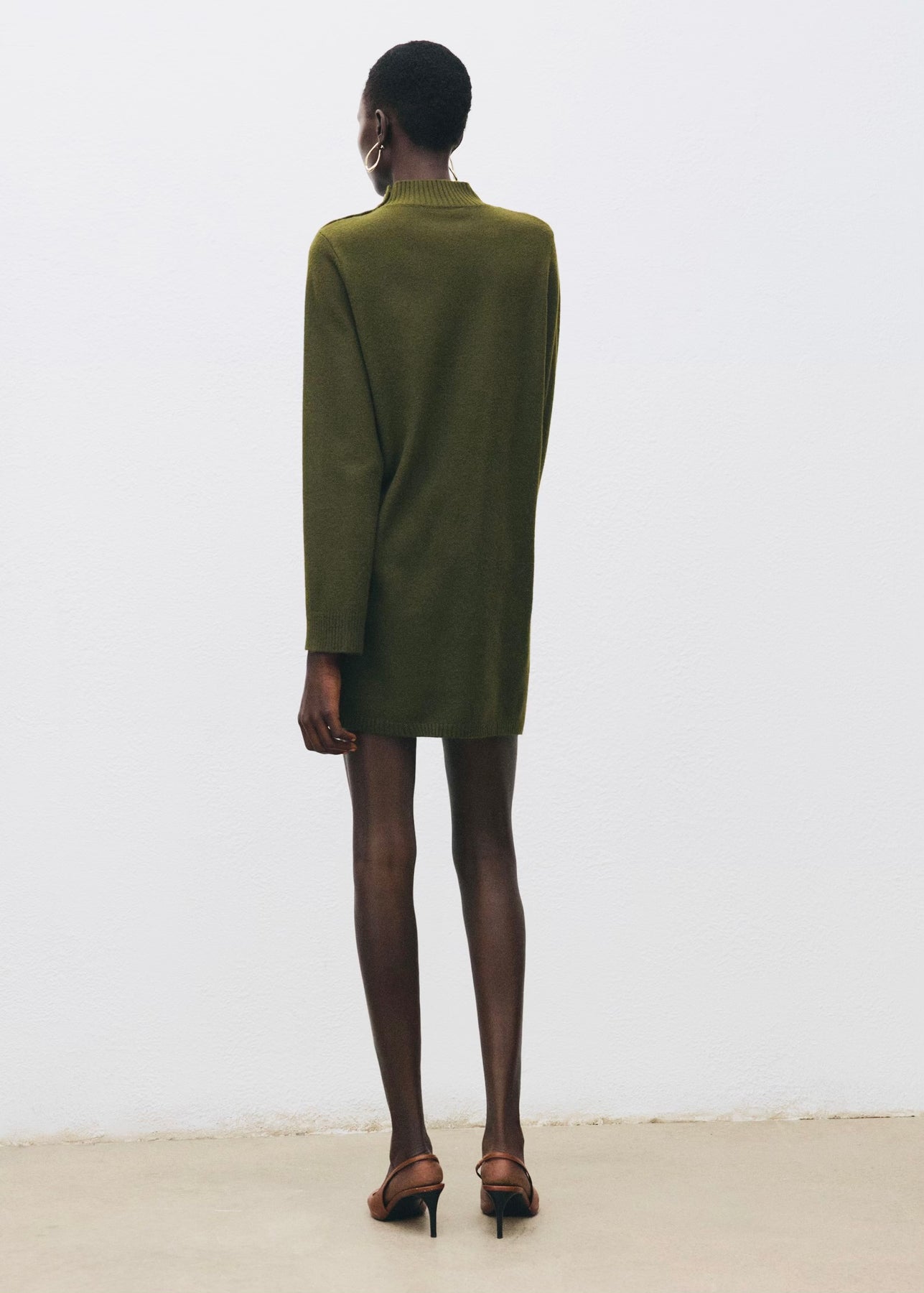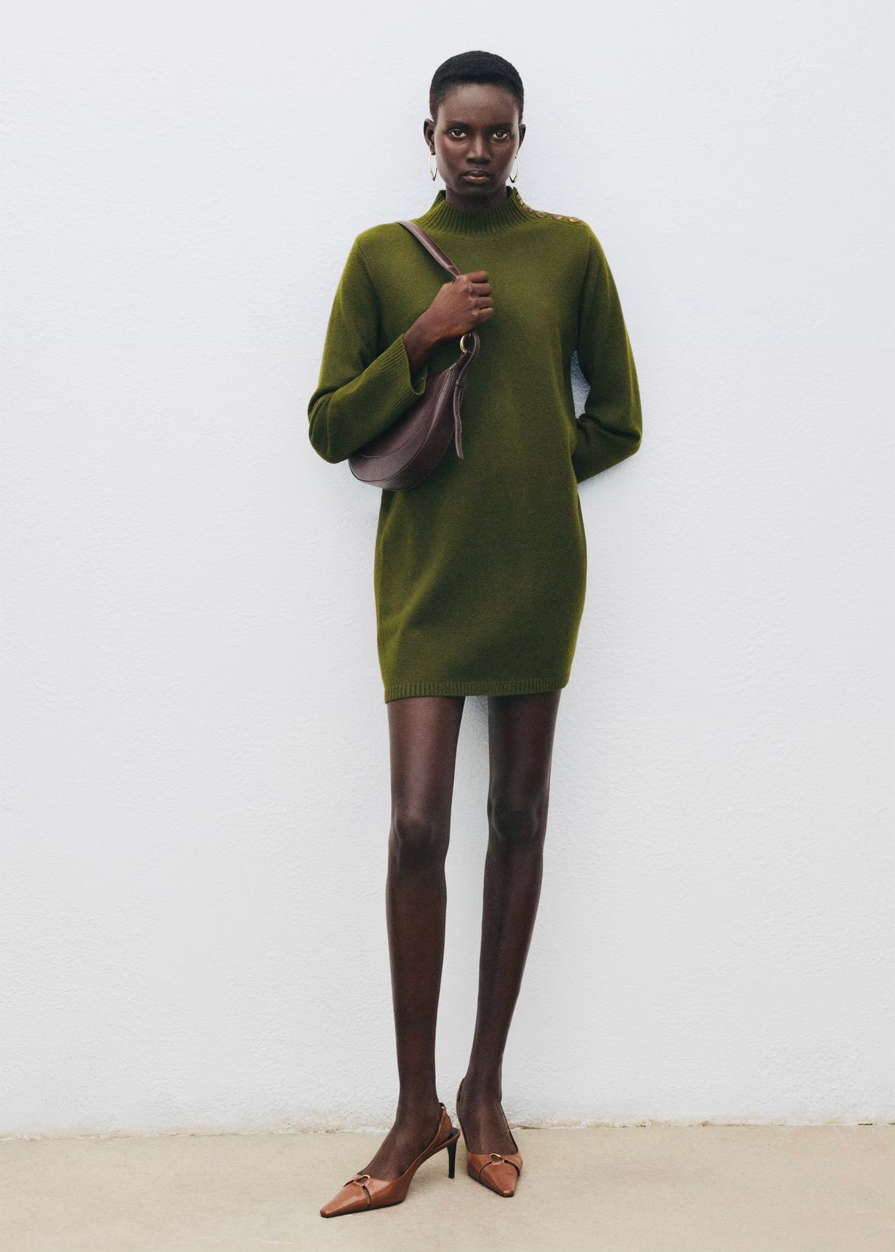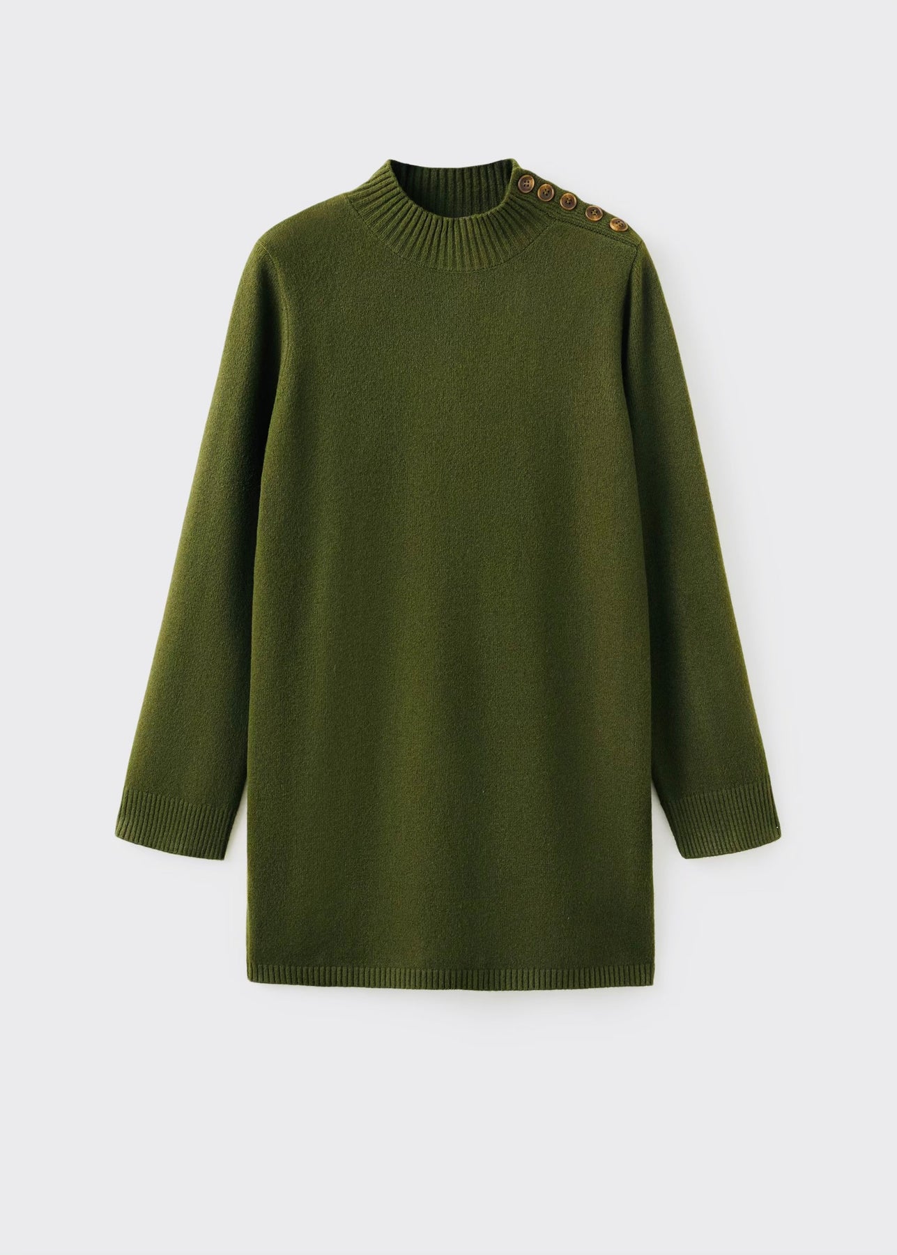 Robe courte en maille avec col Perkins et manches longues. Dotée d’un détail de boutons sur l’épaule, elle allie confort et élégance pour un look moderne au quotidien.