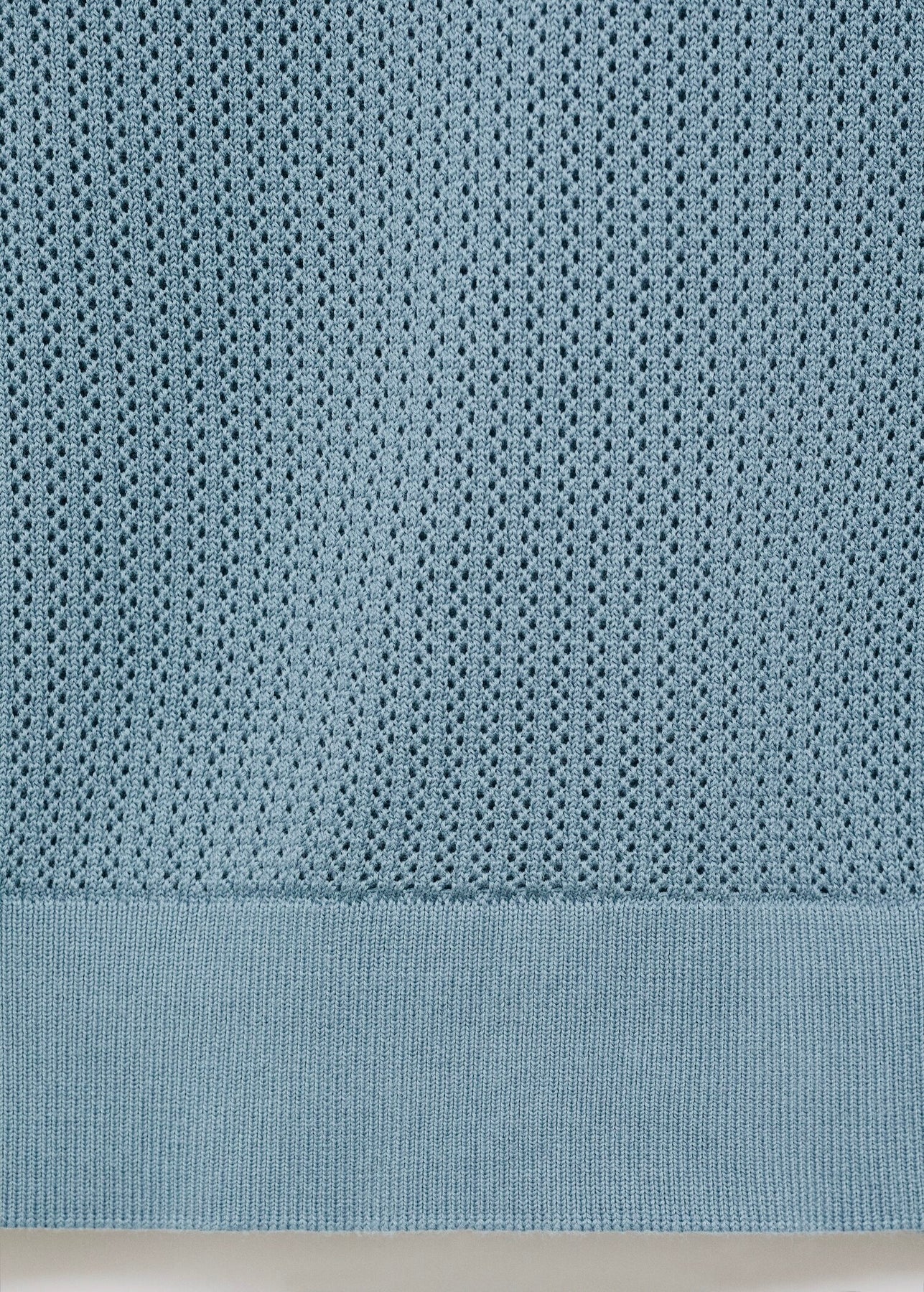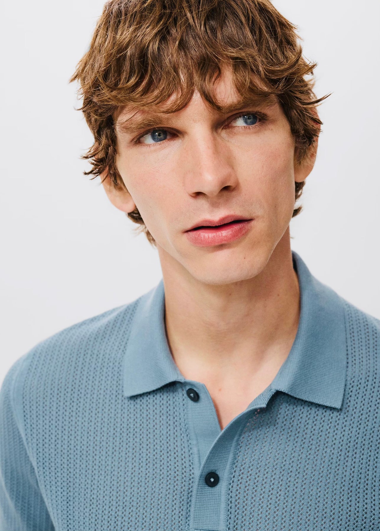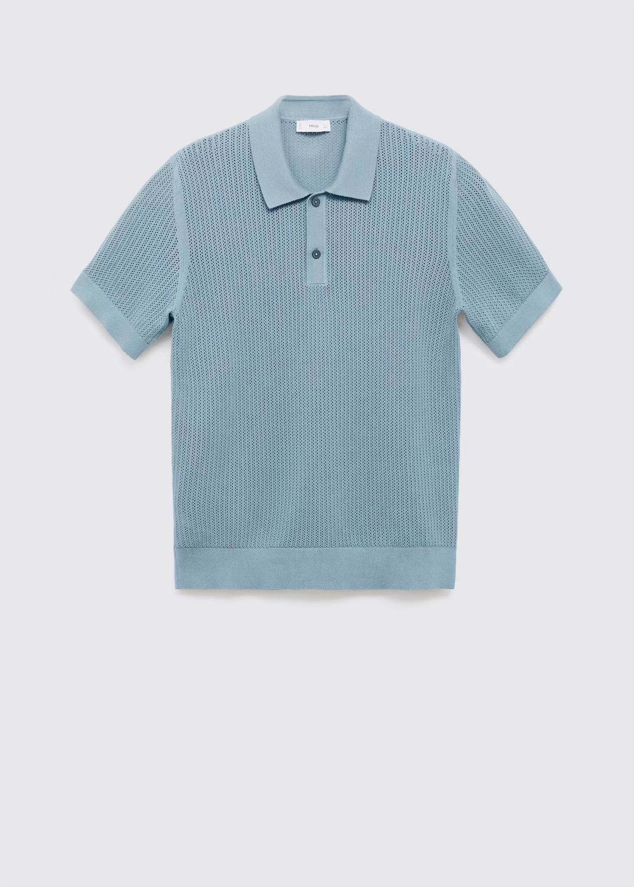 Polo à silhouette droite, confectionné dans un tissu 100% coton en maille fine ajourée pour un effet léger et texturé. Il présente un col polo avec fermeture à boutons, des manches courtes, et des finitions côtelées au col, aux manches et à la base.