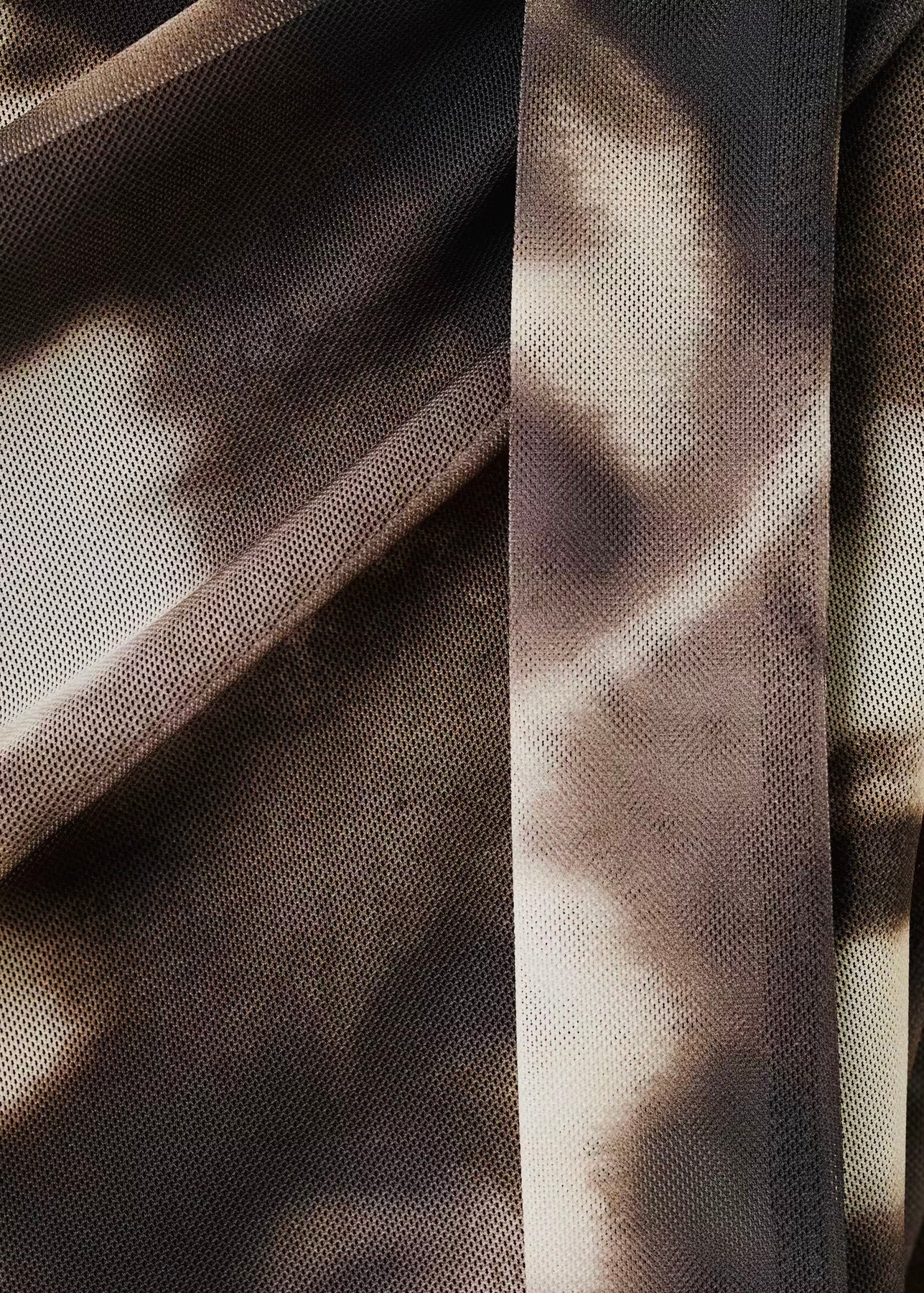 T-shirt à coupe ajustée orné d’un imprimé fleuri et d’une encolure asymétrique avec foulard intégré pour une touche élégante. Il présente des fronces latérales et des manches longues, alliant confort et style.